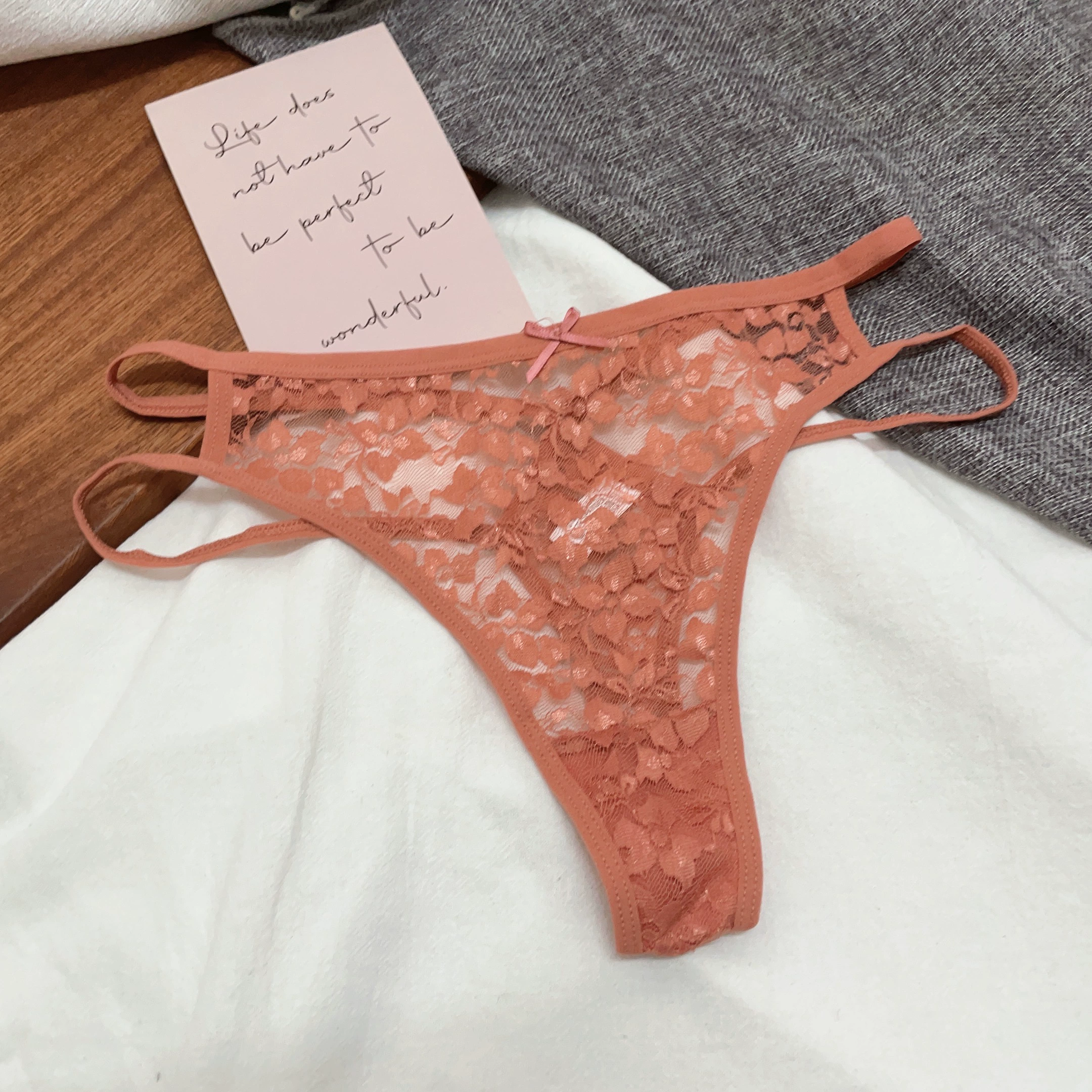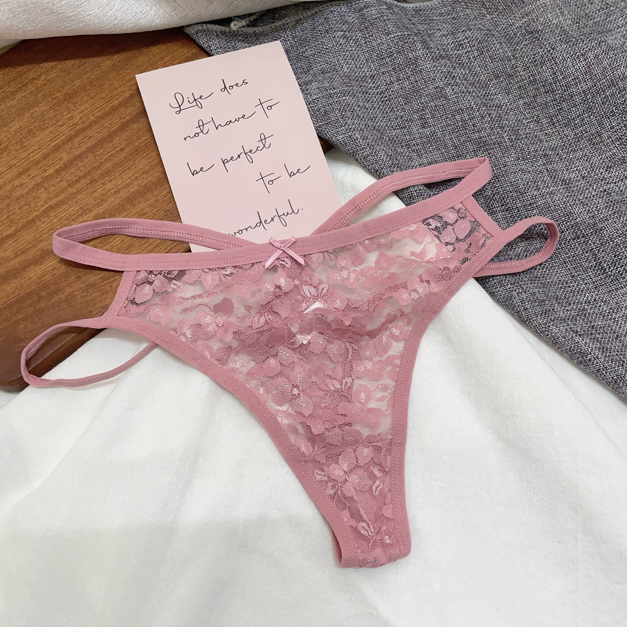 Simple sexy lace thong with thin straps, tempting pink panties, low-waist girl’s underwear, dating new style, see-through