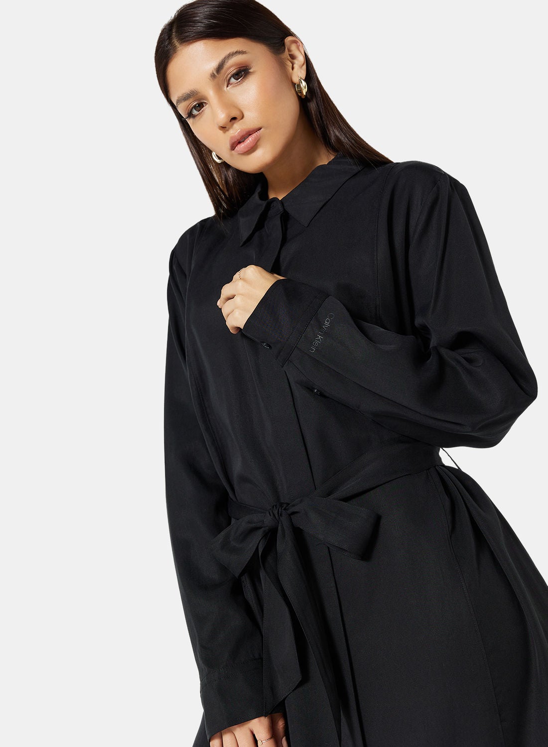 This product features a collared neck and long sleeves made from a soft and sustainable lyocell fabric. It has a secure button closure to the front and includes care label instructions for washing. Additionally, the product showcases the signature branding detail of Calvin Klein.