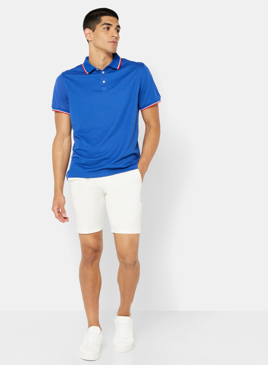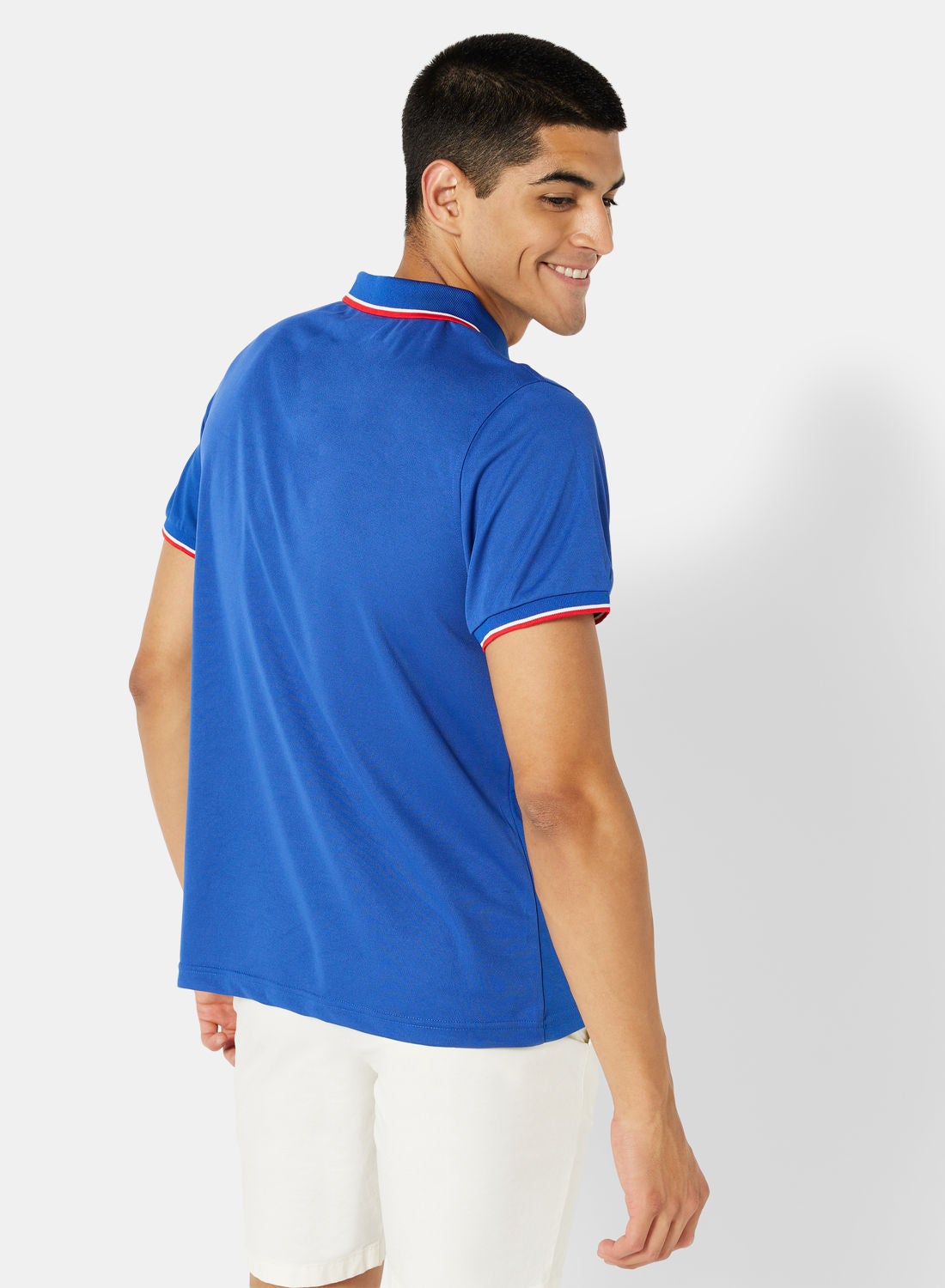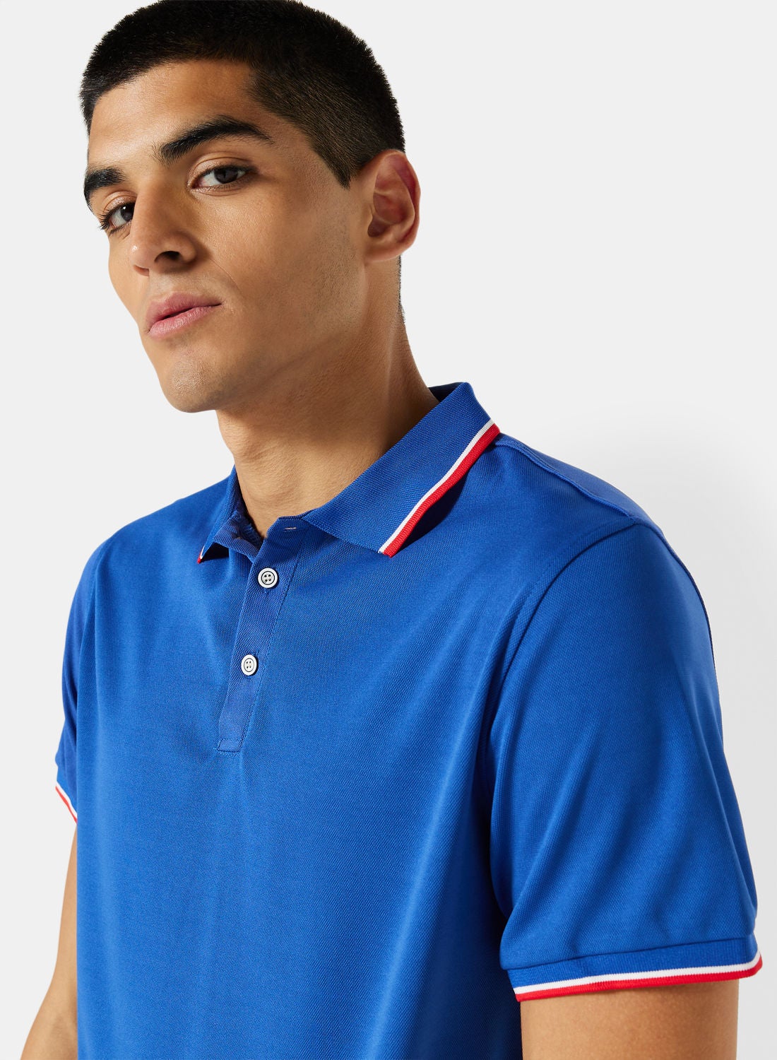 This product features a polyester fabric that is both stretchy and semi-breathable. It has a dual tone stripe pattern on the neckline and arm cuffs, with a collar neck and short sleeves. The front placket is secured with buttons for added convenience. The fit is comfortable and regular, and it is recommended to follow the care label instructions when washing. The model is approximately 183 cm tall and is wearing a size M.