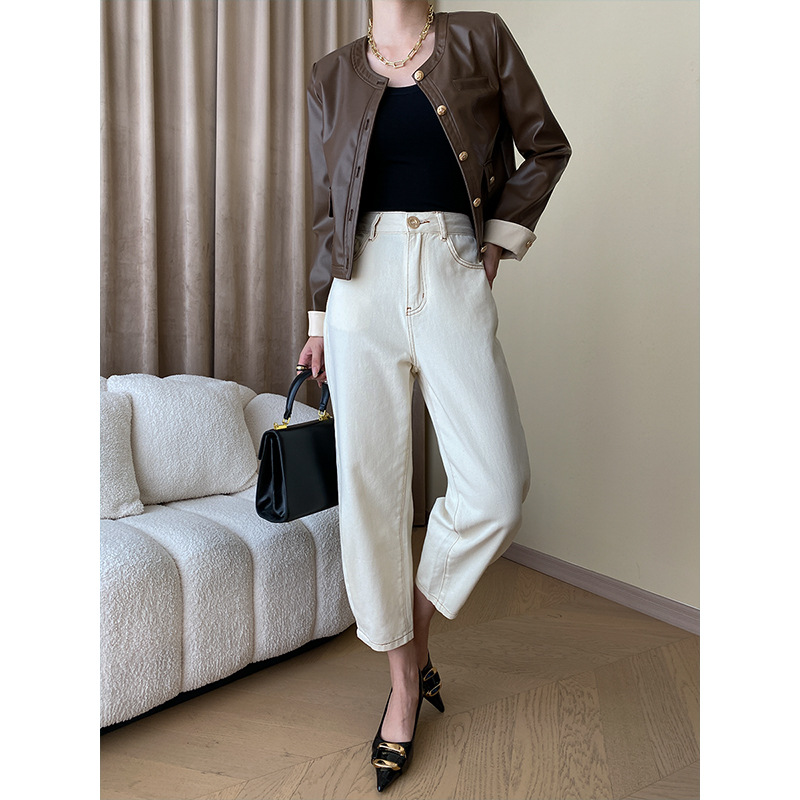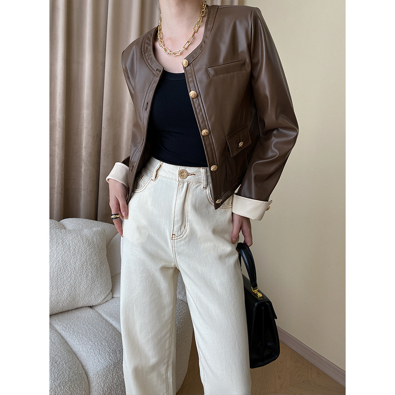 | nameOriginal | Sinan tone contrast color cuff French gold buckle round neck high-grade elegant leather coat short SN4336 |