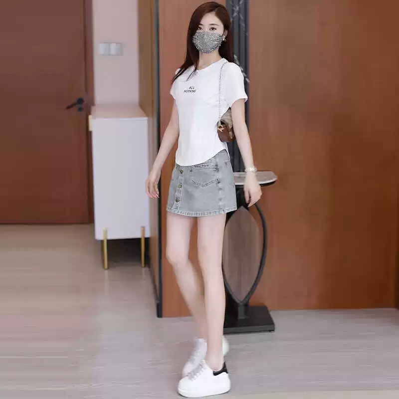 Single-breasted denim style A-shaped anti-exposure short-sleeved shirt