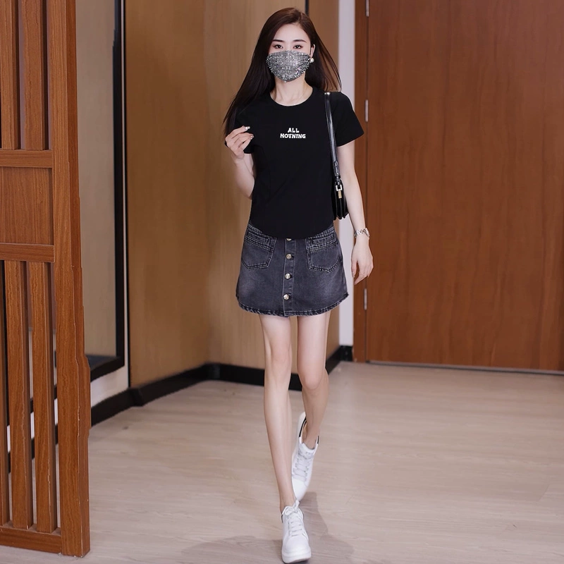 Single-breasted denim Hong Kong style A-line anti-exposure short-sleeved shirt