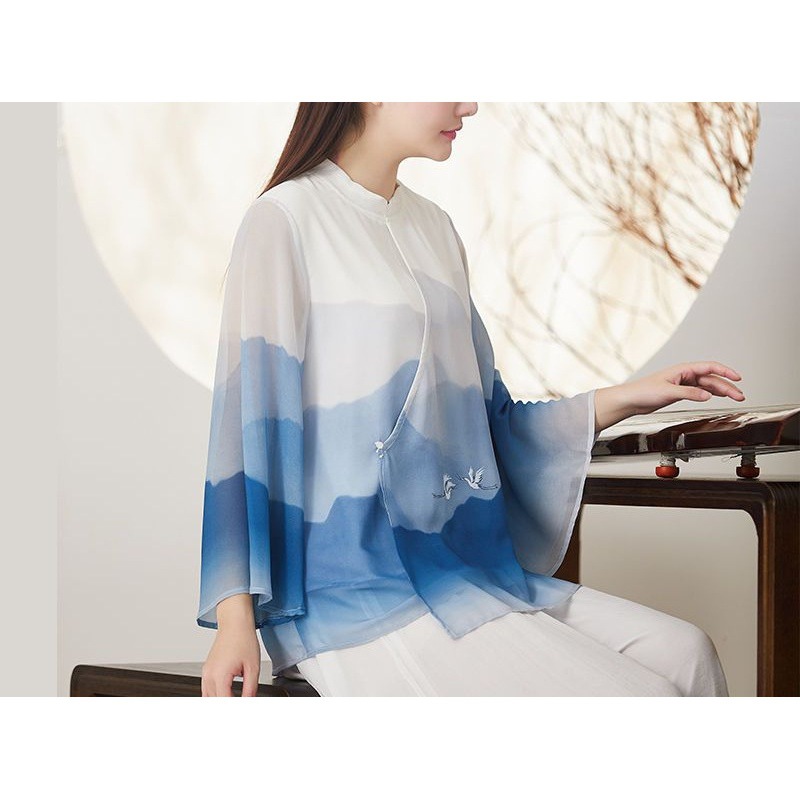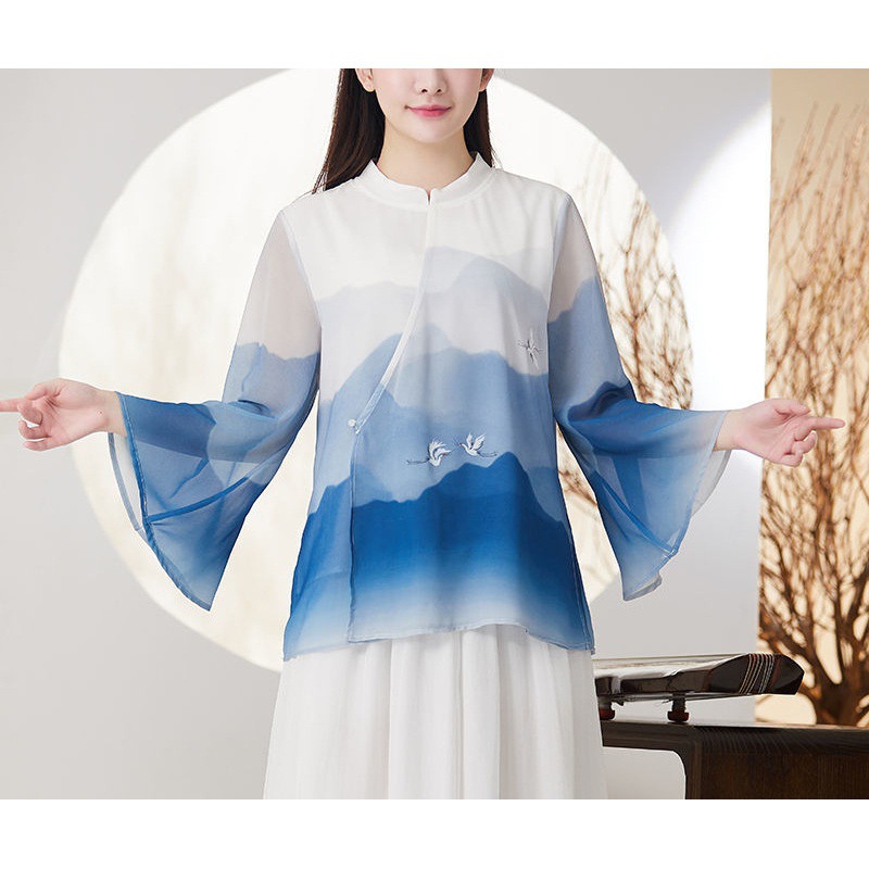 Single/Two-Piece Set 2024 Summer Chinese Style Zen Style Modified Hanfu Element Skirt Hand-Painted Printed Chiffon Tea