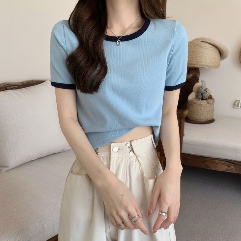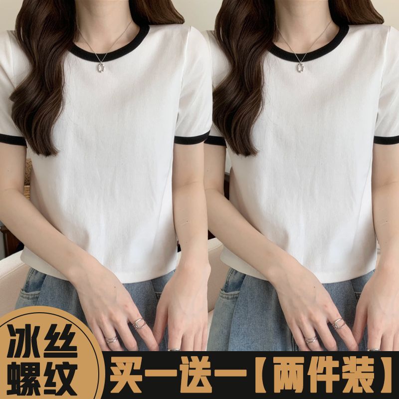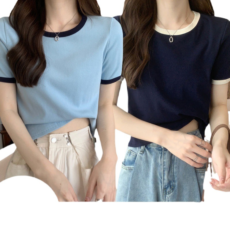 | nameOriginal | Single/Two Pieces Ice Silk Summer New Color Contrast Short-sleeved Shirt Women's Stylish Loose Round Neck Fashionable All-match Shoulder Top |