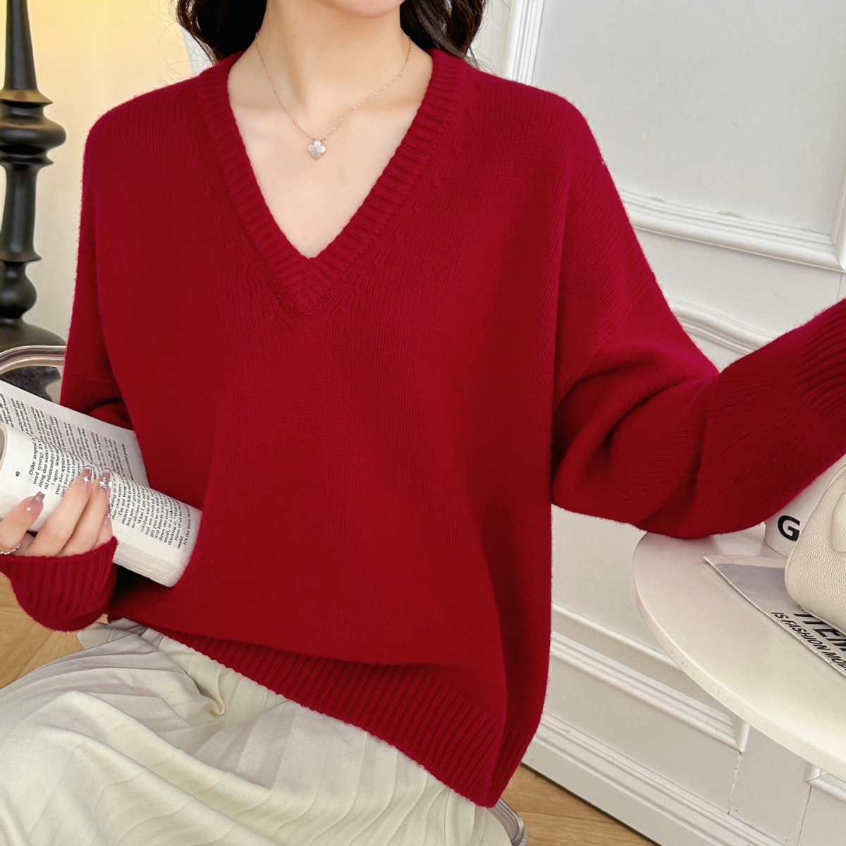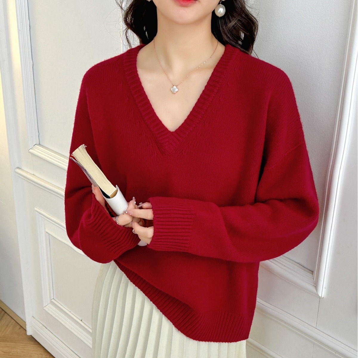 Sister JILL same style sai Linlin superior Radian all-in-one V-neck slimming wool 2024 early spring new sweater