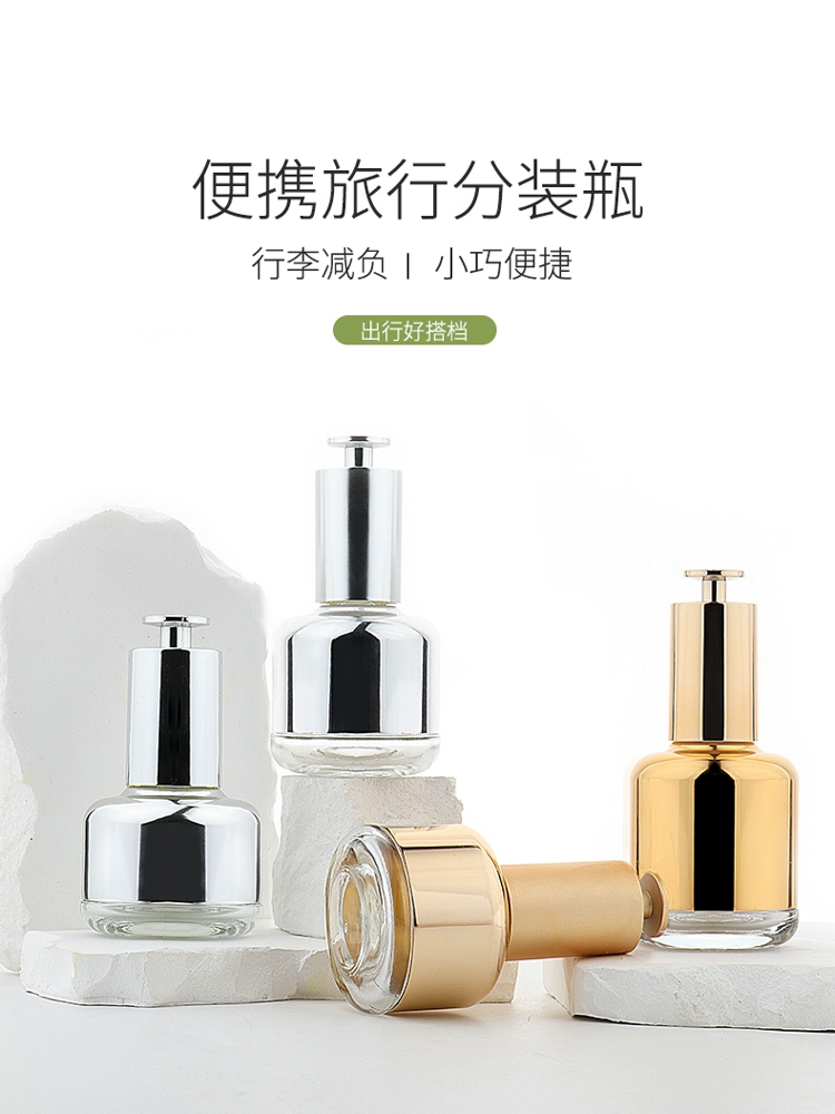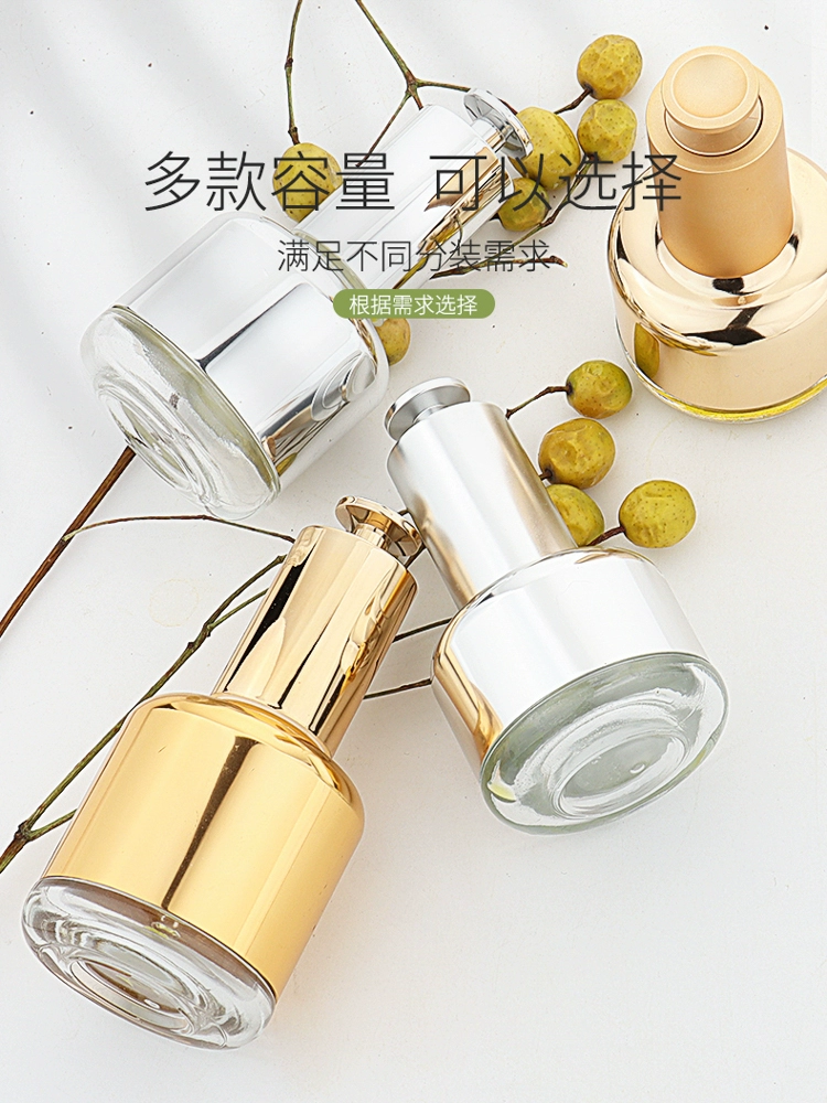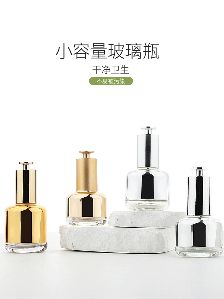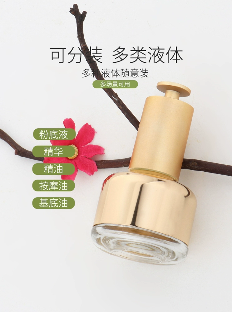 | nameOriginal | Skin care product dispensing bottle HOPECK electroplated aluminum gold T-cap style press 20 teeth essence essential oil dropper small empty bottle |