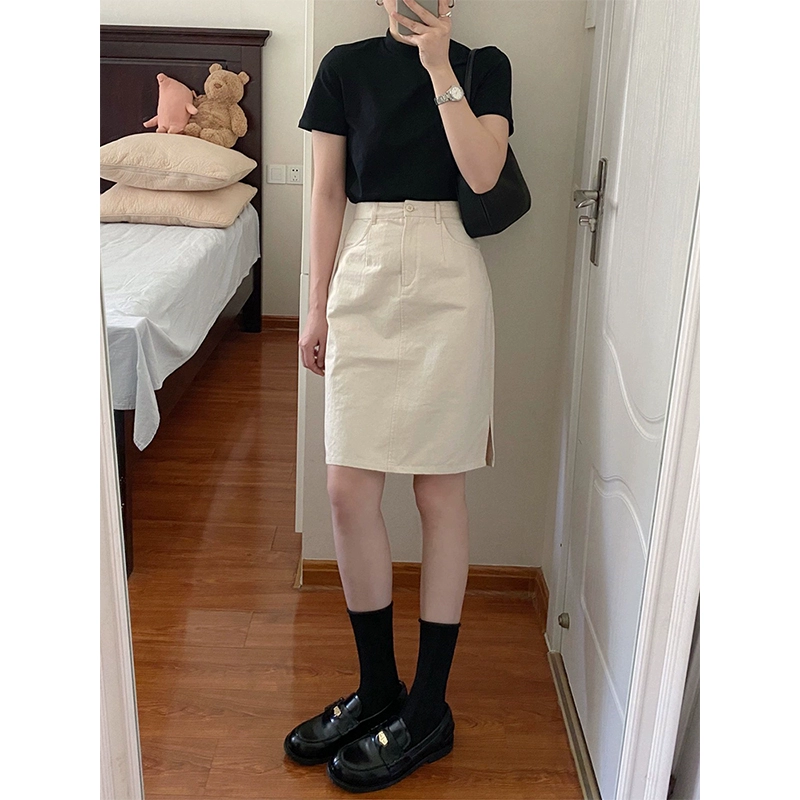 Skirt suitable for pear-shaped figures, slimming belly-covering denim mid-skirt for fat mm, large size slit women’s skirt for summer