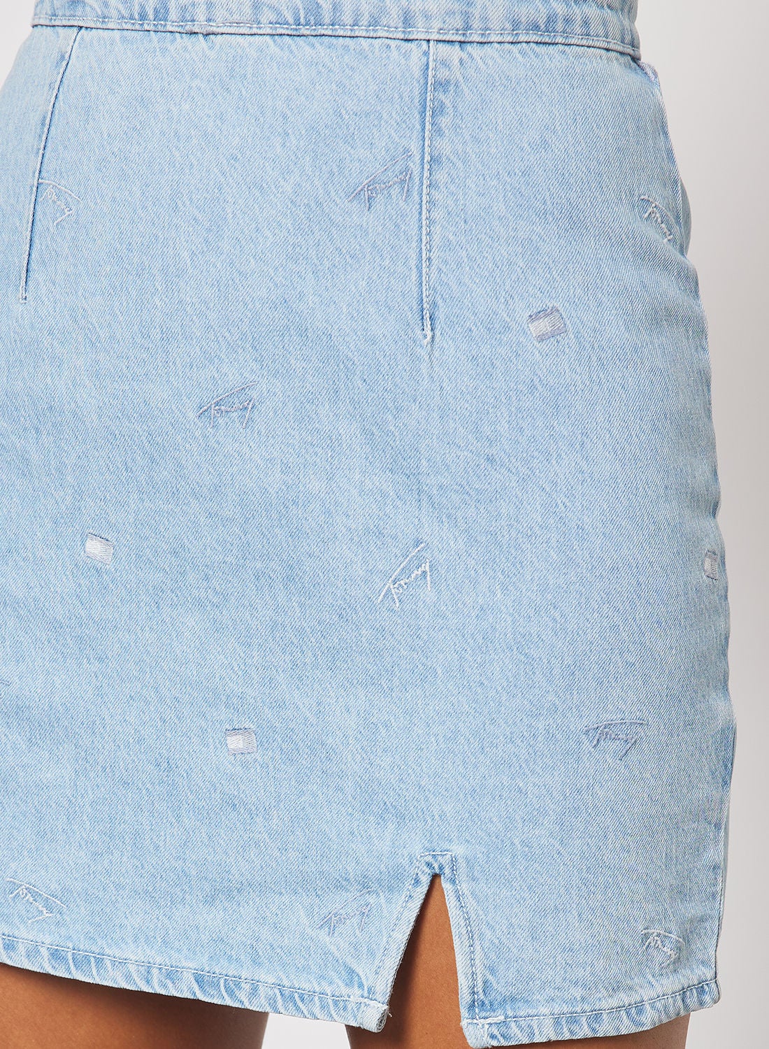This product features a soft and breathable denim fabric made from organic cotton. It has a secure zipper closure at the back and a comfortable, regular fit. The Tommy Jeans signature branding detail adds a stylish touch. To maintain its quality, please follow the care label instructions when washing. The model is approximately 177 cm tall and is wearing a size S.