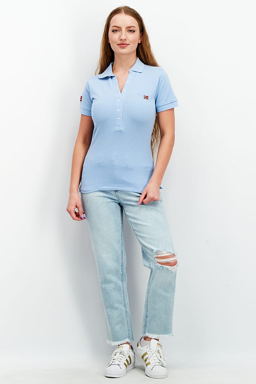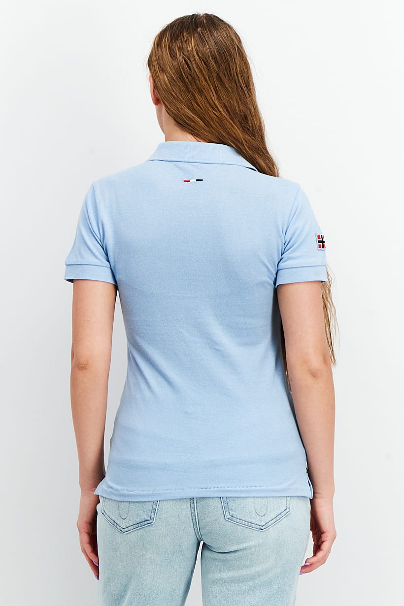 | nameOriginal | Women Spread Collar Short Sleeve Embroidered Logo Top, Sky Blue |