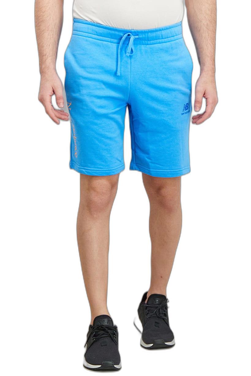This product is easy to care for as it is machine washable. It has a sportswear fit and is designed for outdoor activities. Please note that the product color may appear slightly different due to lighting or monitor settings. Made from 100% cotton, this product features a brand logo pattern and print. It is a pair of blue shorts that are suitable for sports occasions. The size shown is in US measurements and the fabric is light in thickness.