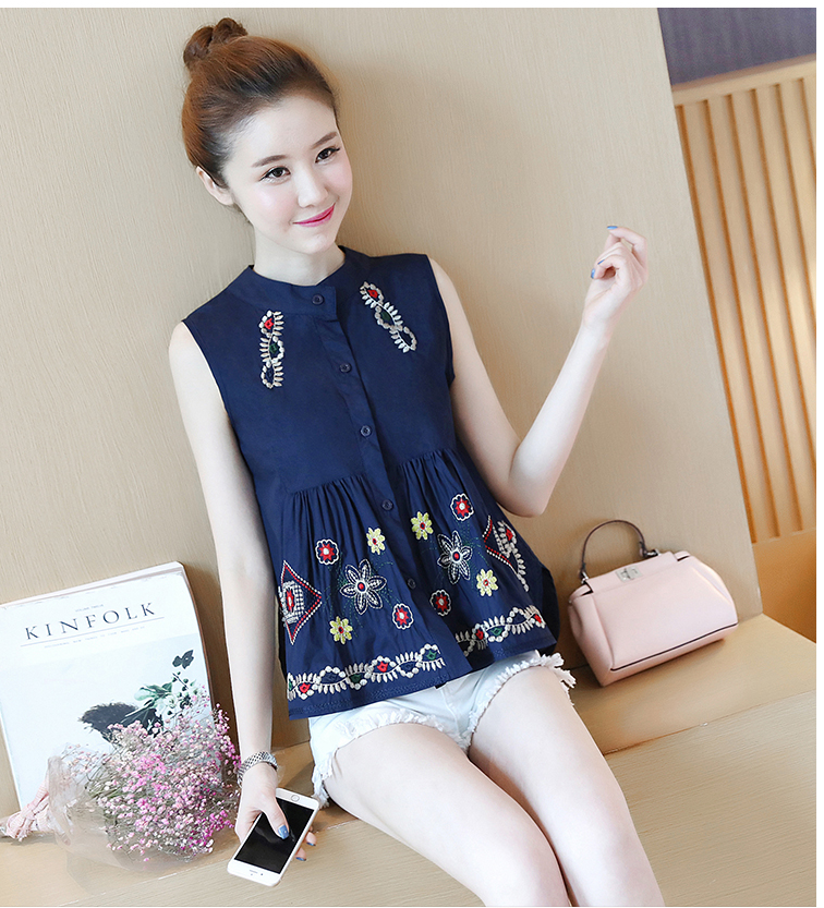 Sleeveless ethnic style embroidered stand collar vest cotton shirt