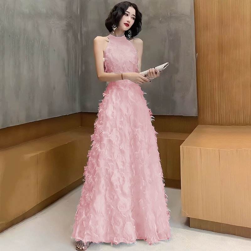 | nameOriginal | Sleeveless halter neck long mini dress for birthday party |