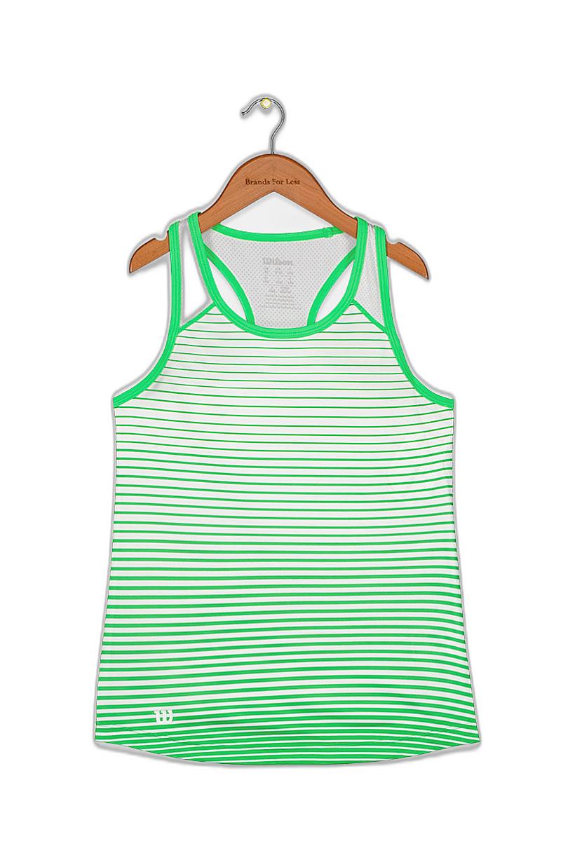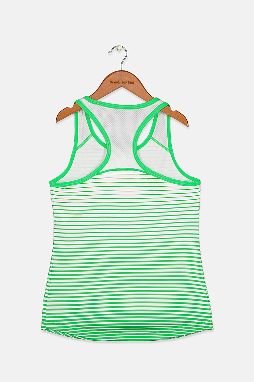 This product is suitable for girls and is designed for training purposes. It is made of 100% polyester fabric and can be easily machine washed. The top features a stripe pattern and print in a lime green color family. It has a pullover closure and is ideal for various sporting occasions. Please note that the product color may appear slightly different due to photographic lighting sources or monitor settings.