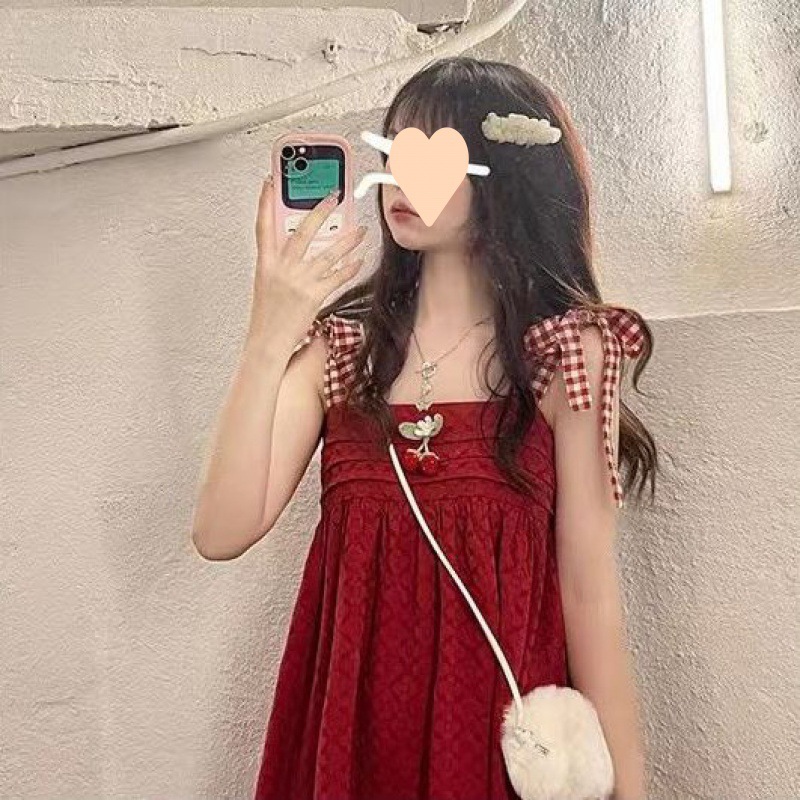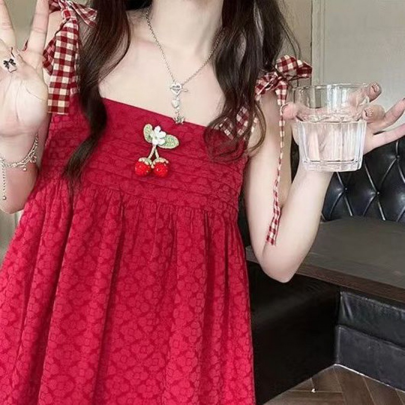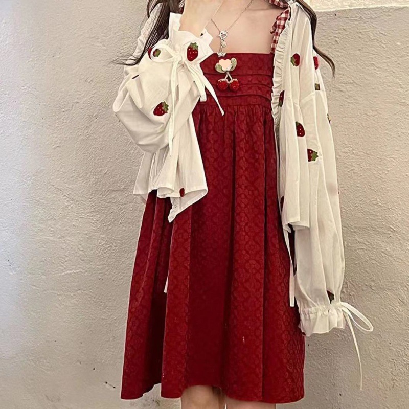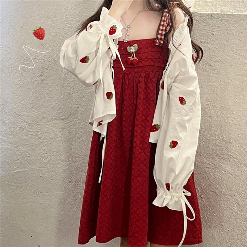 | nameOriginal | Sleeveless Straight Collar Raspberry Color Sling dress Girl Student Cute Raspberry Printed Shirt Two Pieces/suit Trendy |