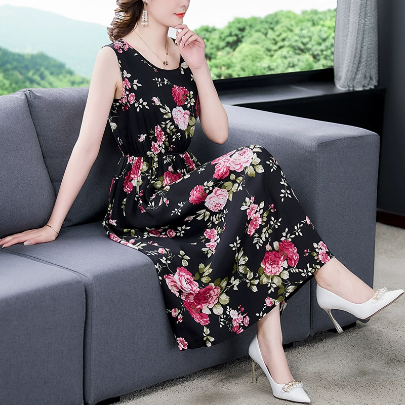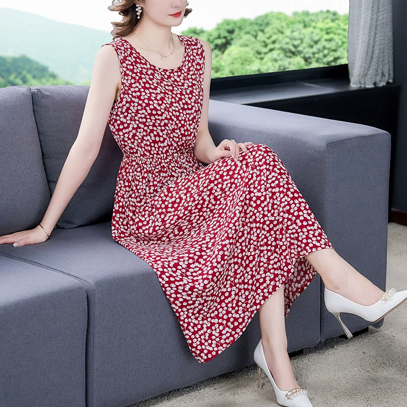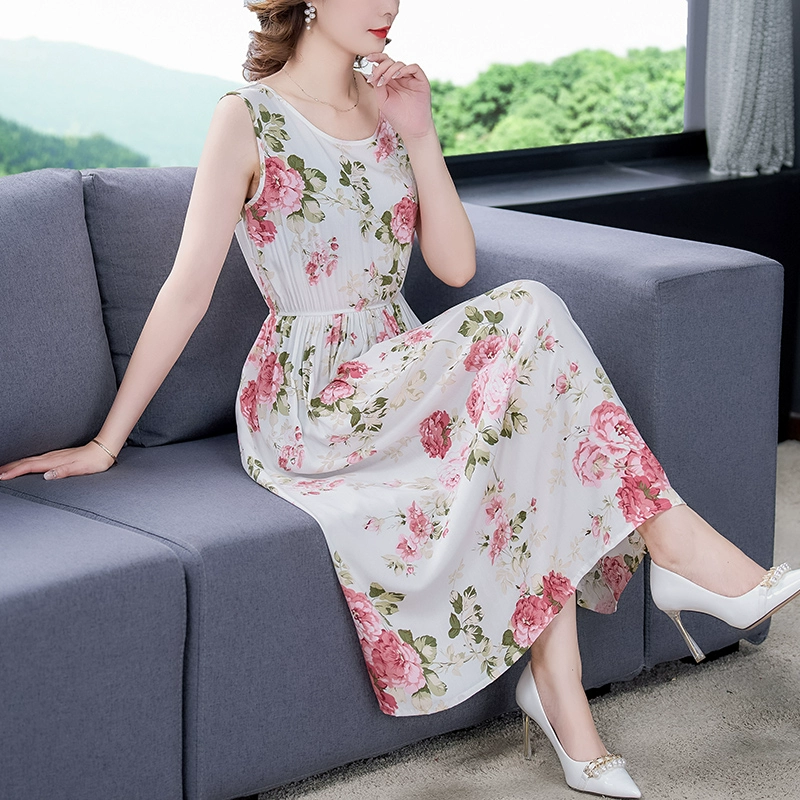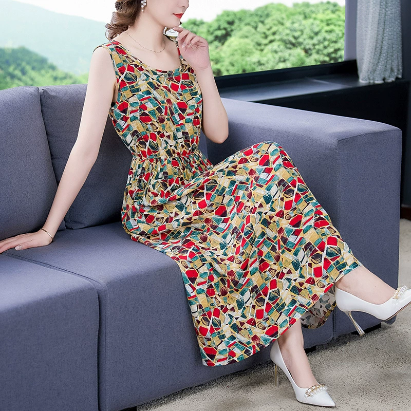 Sleeveless suspender floral cotton silk dress women's mid-length mother's summer dress seaside vacation artificial cotton long skirt