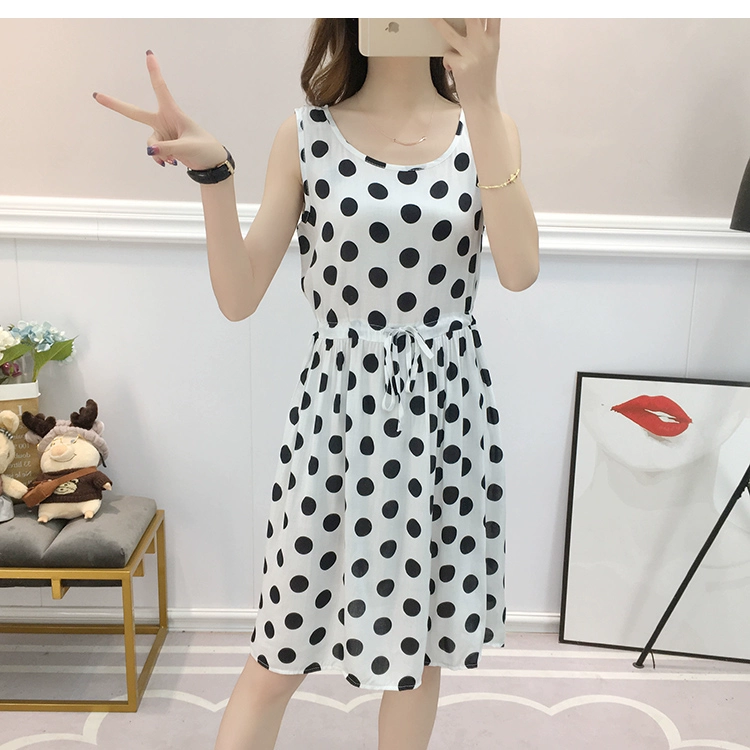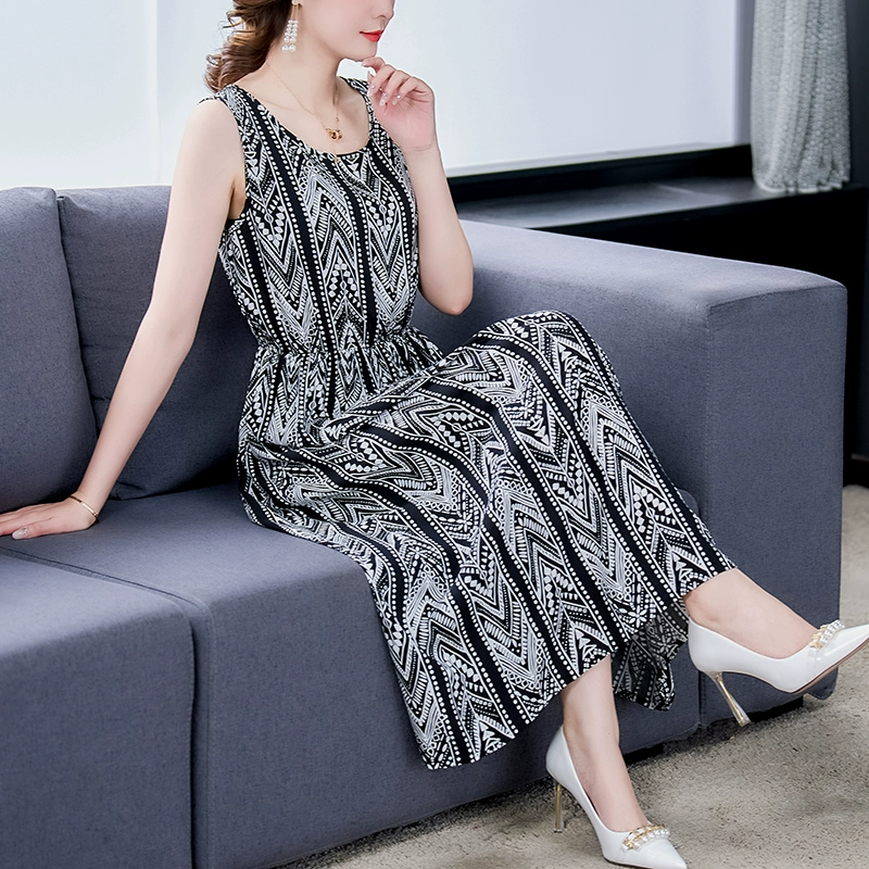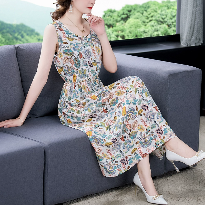 Sleeveless suspender floral cotton silk dress for women mid-length mother summer clothing seaside vacation artificial cotton long skirt