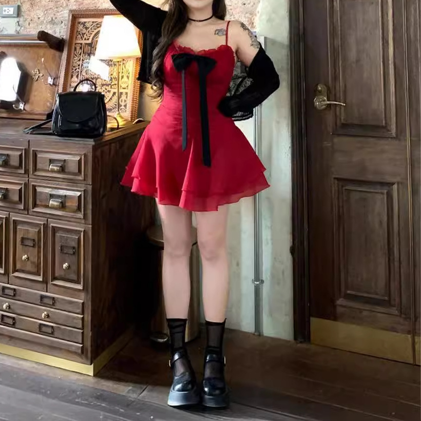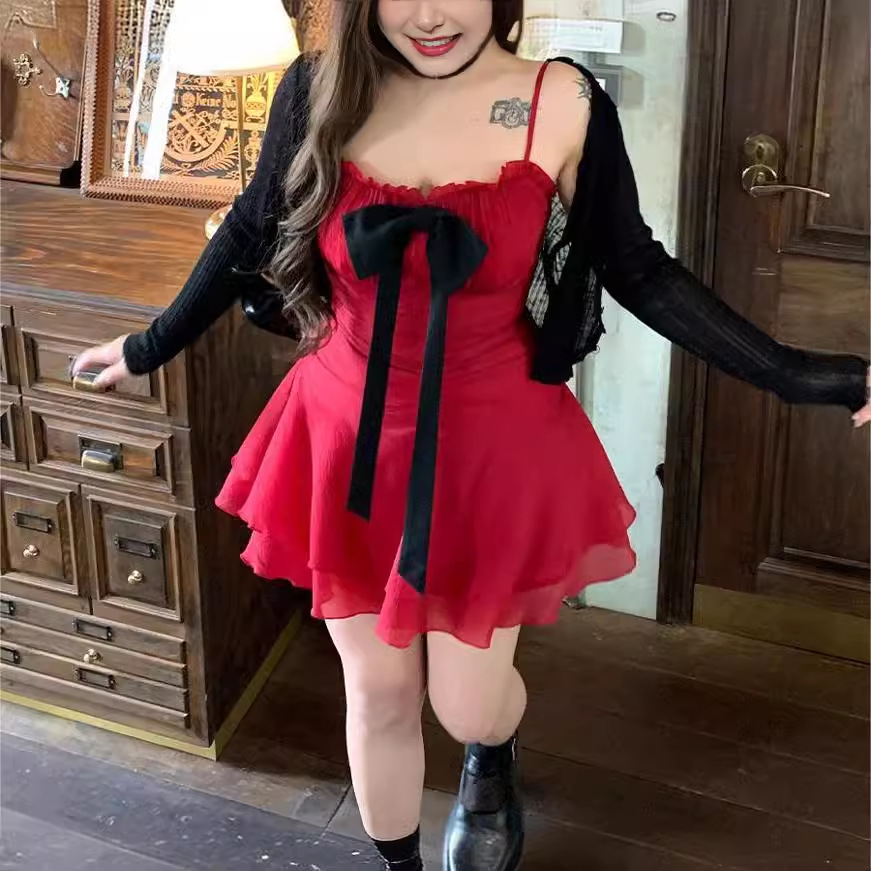 | nameOriginal | Slight Chubby plus size Bow Ribbon dress Women's Waist 2024 Summer New Red Skirt suit Slimming |
