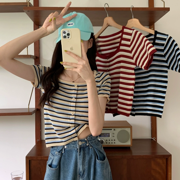 | nameOriginal | Slightly chubby ice silk square-neck short-sleeved right-shoulder striped sweater |