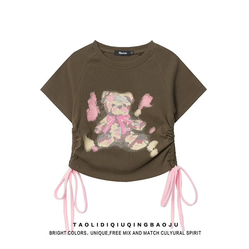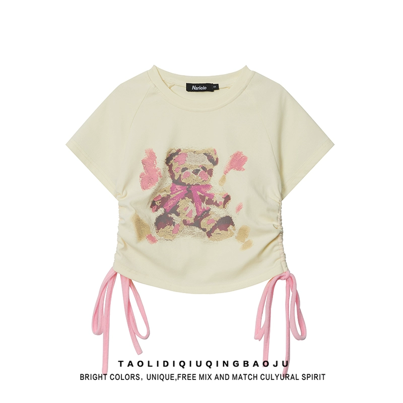 Slim fit drawstring short-sleeved T-shirt with bear print design