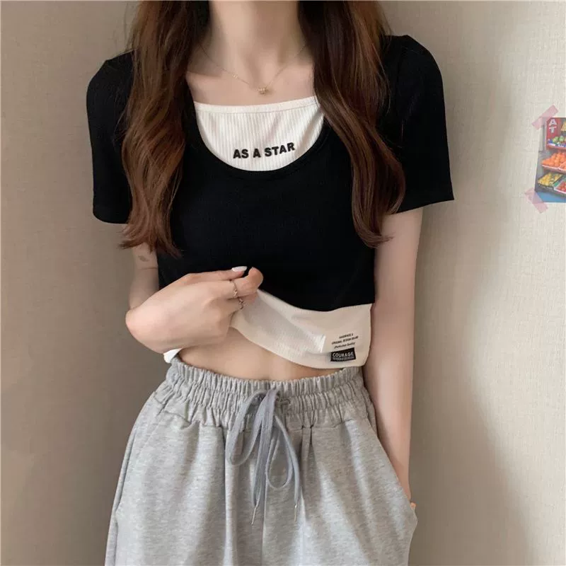 | nameOriginal | Slim-fitting fake two-piece high-waist navel-baring short-sleeved T-shirt |