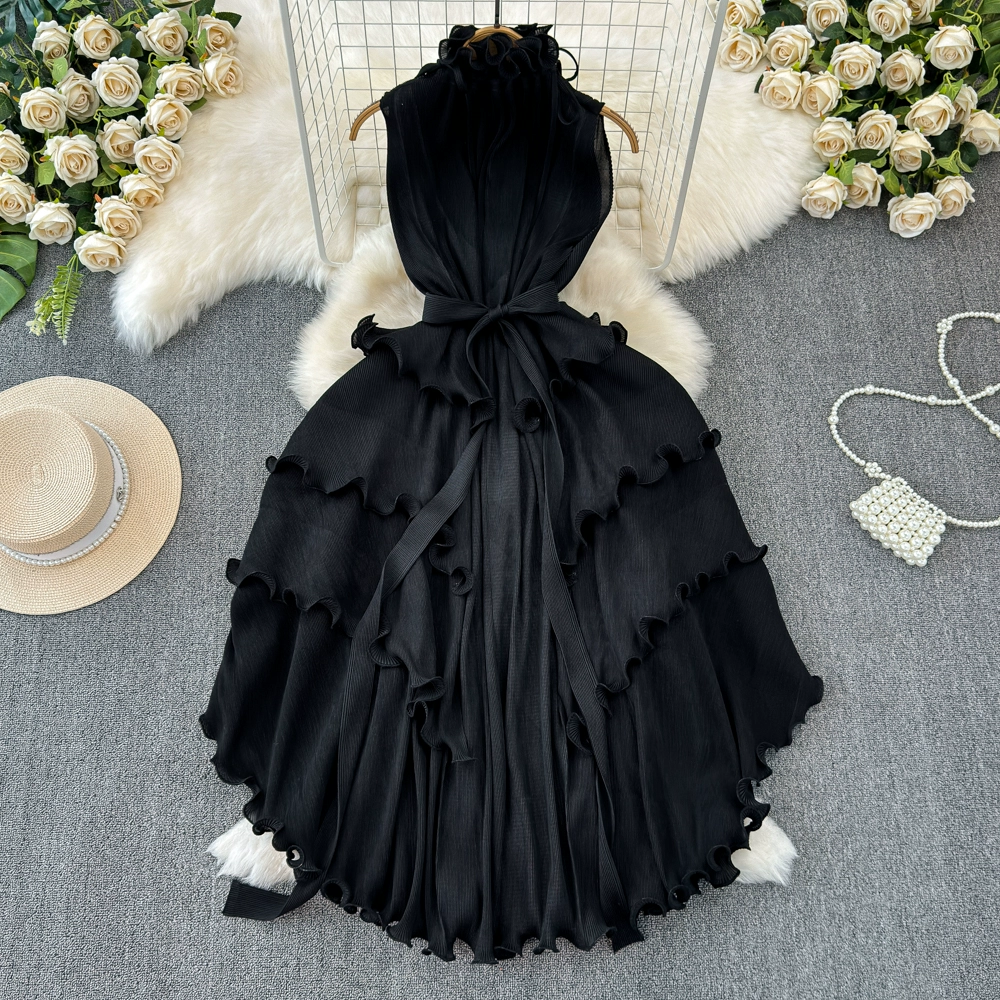 | nameOriginal | Slim-fitting long pleated chiffon dress with earrings |