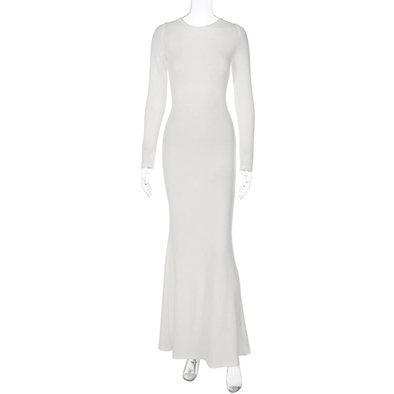 slim lace backless long sleeve solid color slim fit dress