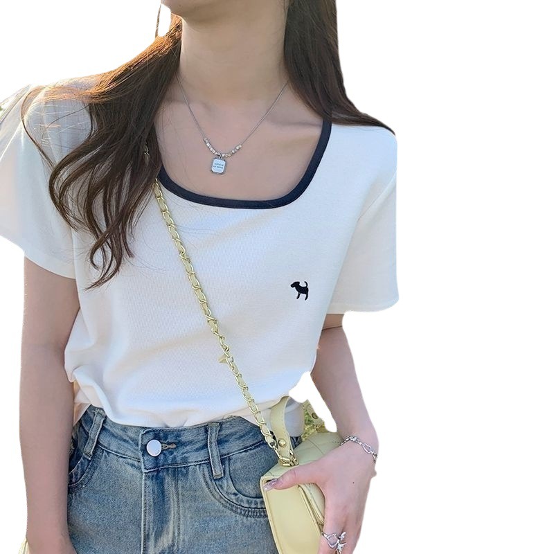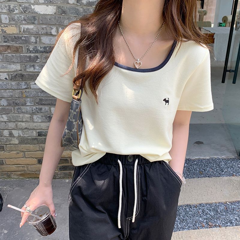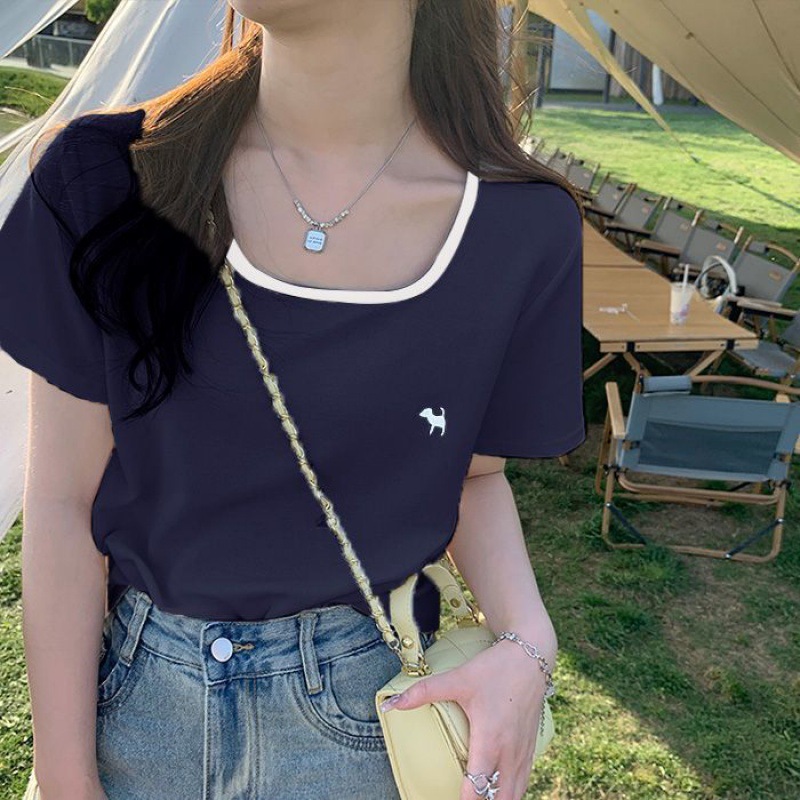 Slim square collar short-sleeved shirt women’s summer foreign style 200kg loose plus size meat covering fat contrast color shoulder top