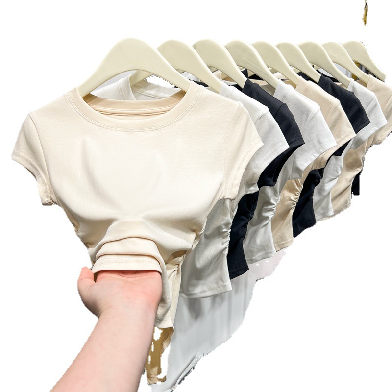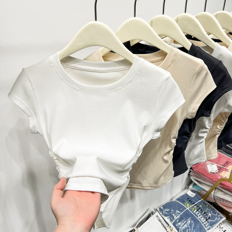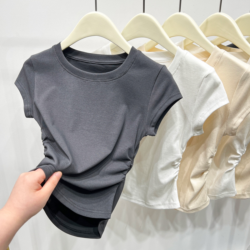 | nameOriginal | Slimming solid color short-sleeved women's T-shirt 2024 Summer new women's clothing design tight waist pleated pure desire top |