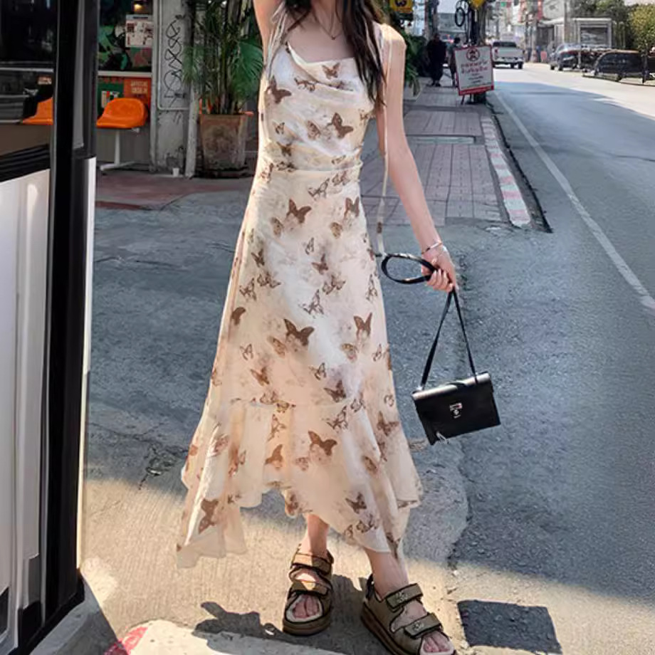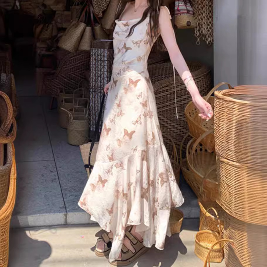 | nameOriginal | Sling Dress Women's Summer Swing Collar Elegant Niche Waist Irregular Butterfly Printed Holiday Fishtail Dress |