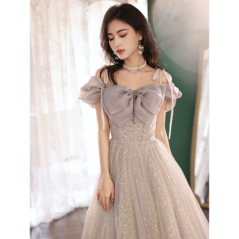 | nameOriginal | Sling Evening Dress Women's 2024 New Gray Banquet Elegant Light Luxury Niche High-end Adult Ceremony Vocal Art Test Dress |