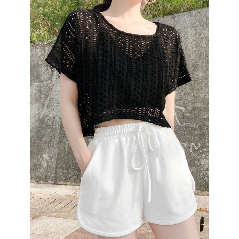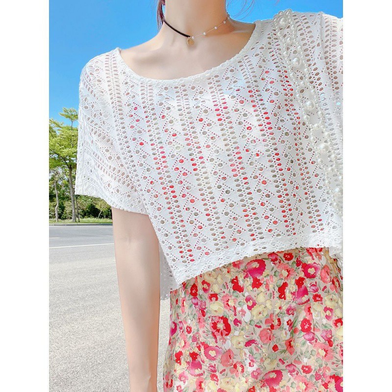 Slip Skirt Overshirt Short-sleeved Women's White Lace Short Hollow Top Pullover Shawl Summer Dress