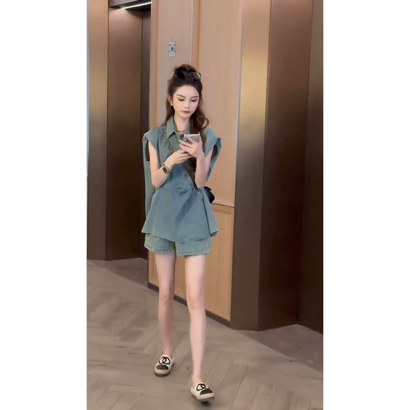 | nameOriginal | Slouchy denim pleated wide-leg two-piece top |