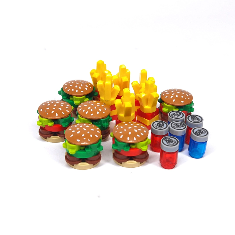 | nameOriginal | Small building block particles hamburger fries MOC simulation food parts DIY beverage can spare parts crystal pile ore |