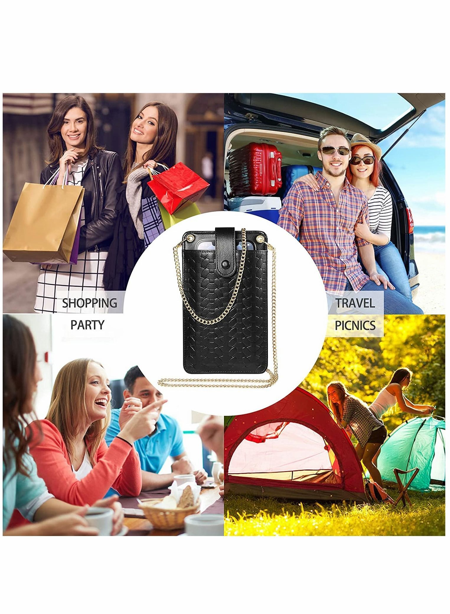 This phone purse is crafted from high-quality PU leather with a woven pattern, making it both eco-friendly and lightweight. It is designed to resist stretching and fading over time. The snap-on button closure allows for easy access to your belongings, while the detachable chain shoulder strap provides hands-free convenience.