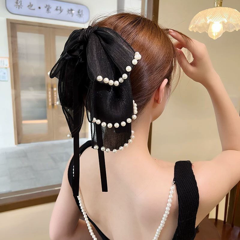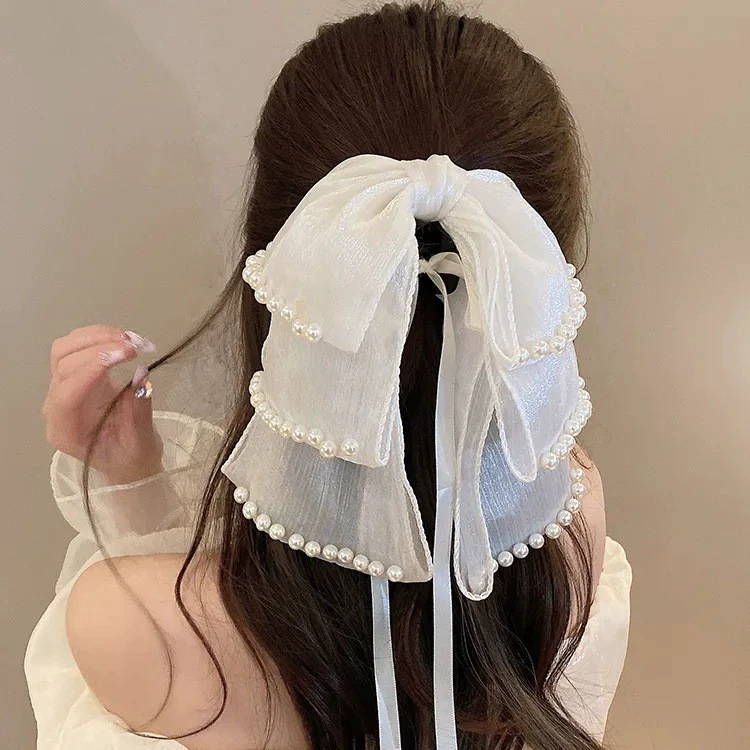 Small fragrance style retro multi-layered bow hair clip with pearls