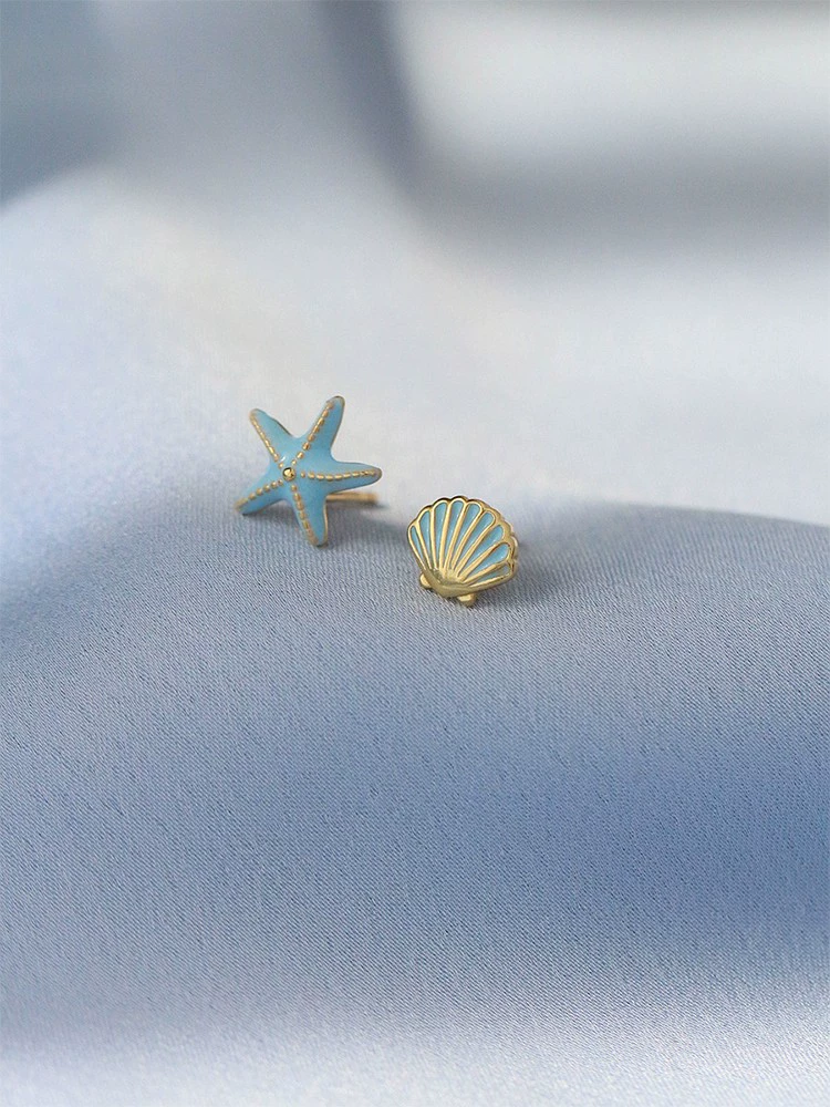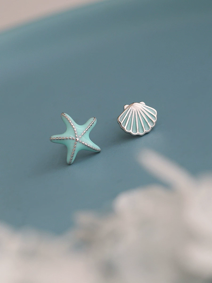 Small fresh blue shell starfish asymmetric earrings niche design cute s925 sterling silver earrings for female students