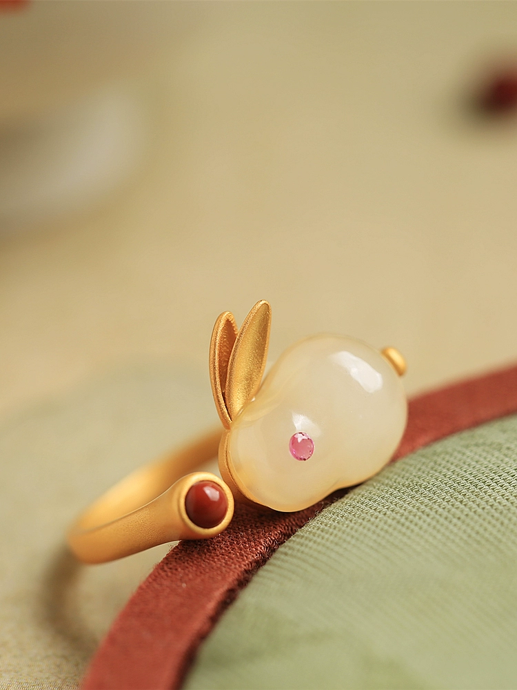 Small silversmith natural Hetian jade sterling silver open rabbit index finger ring for women, national style 18k gold-filled light luxury and high-end sense