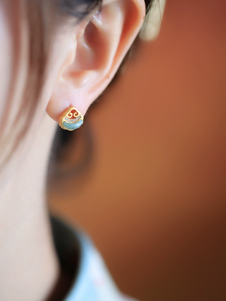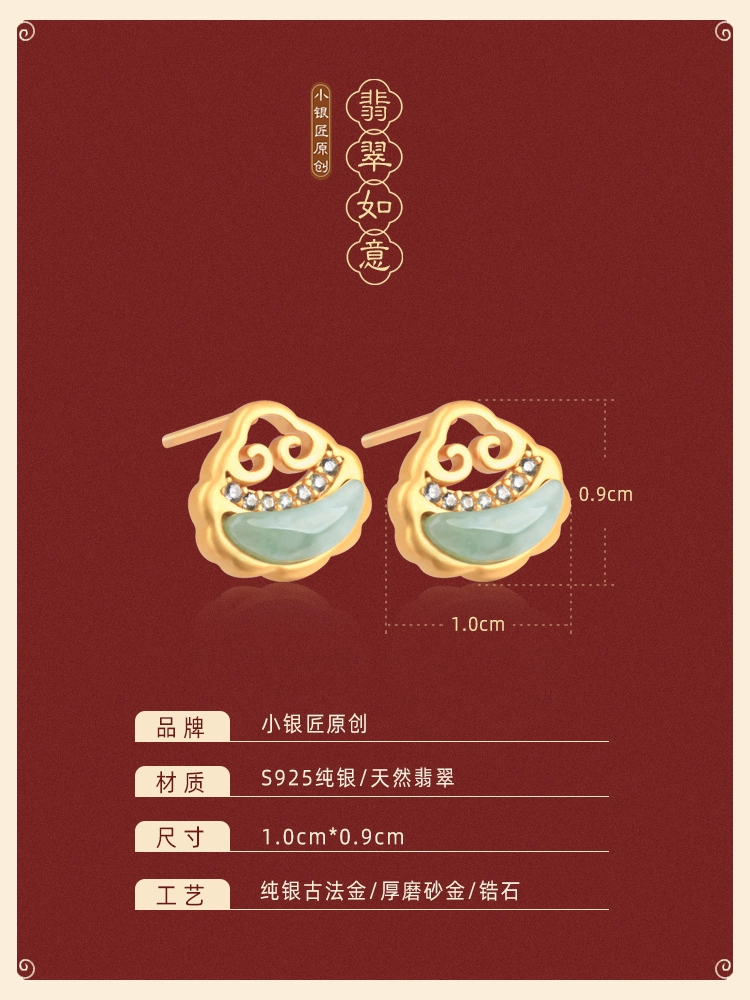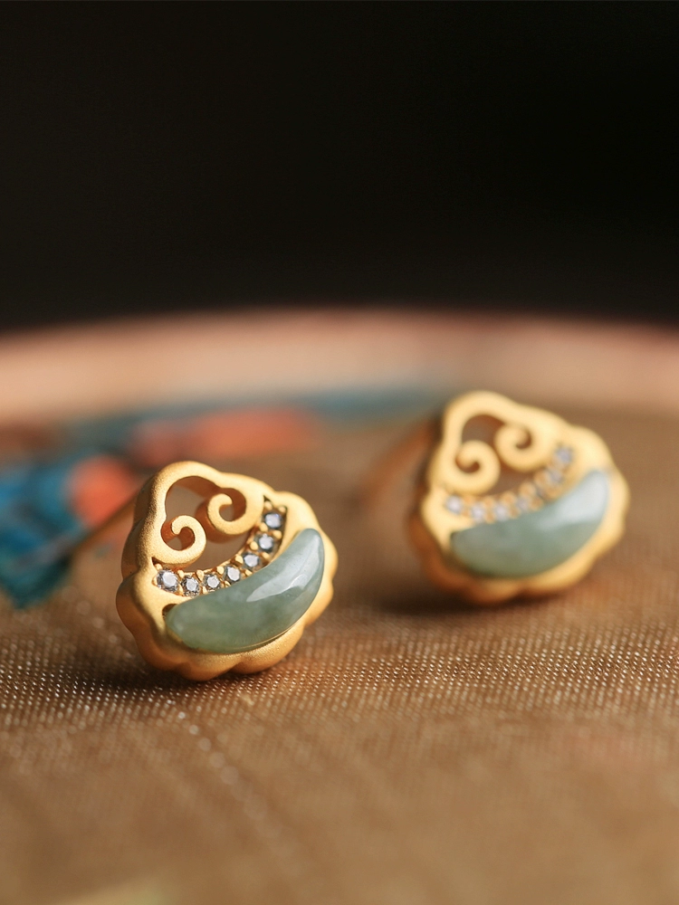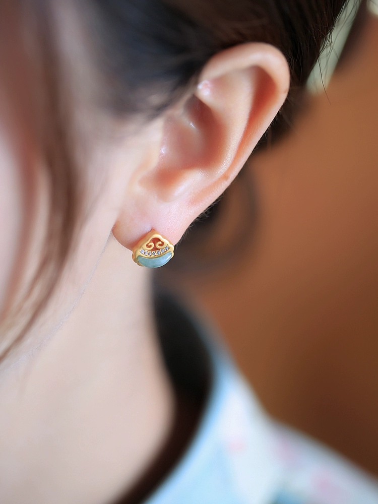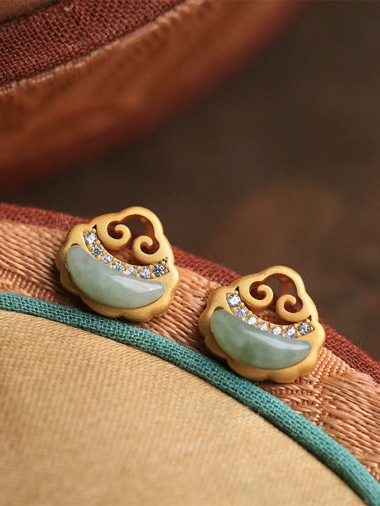 Small silversmith sterling silver ancient gold jade earrings women's Chinese style Ruyi high-end light luxury jade earrings