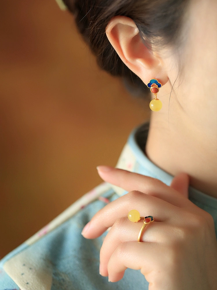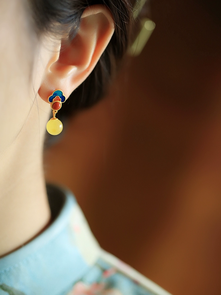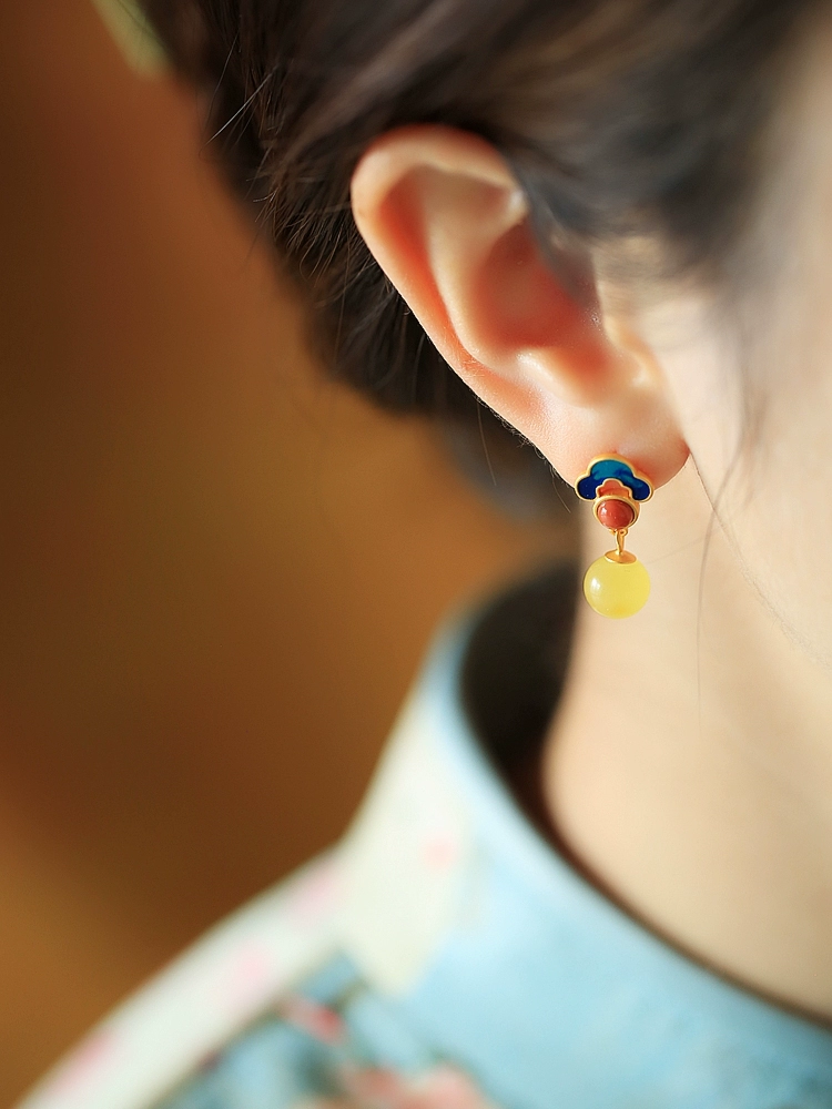 Small silversmith sterling silver ancient gold natural beeswax amber palace retro high-end earrings women's earrings earrings earrings
