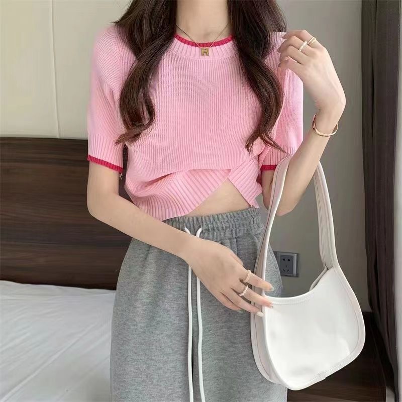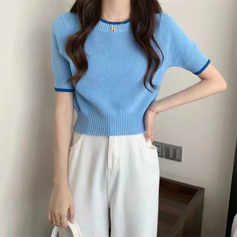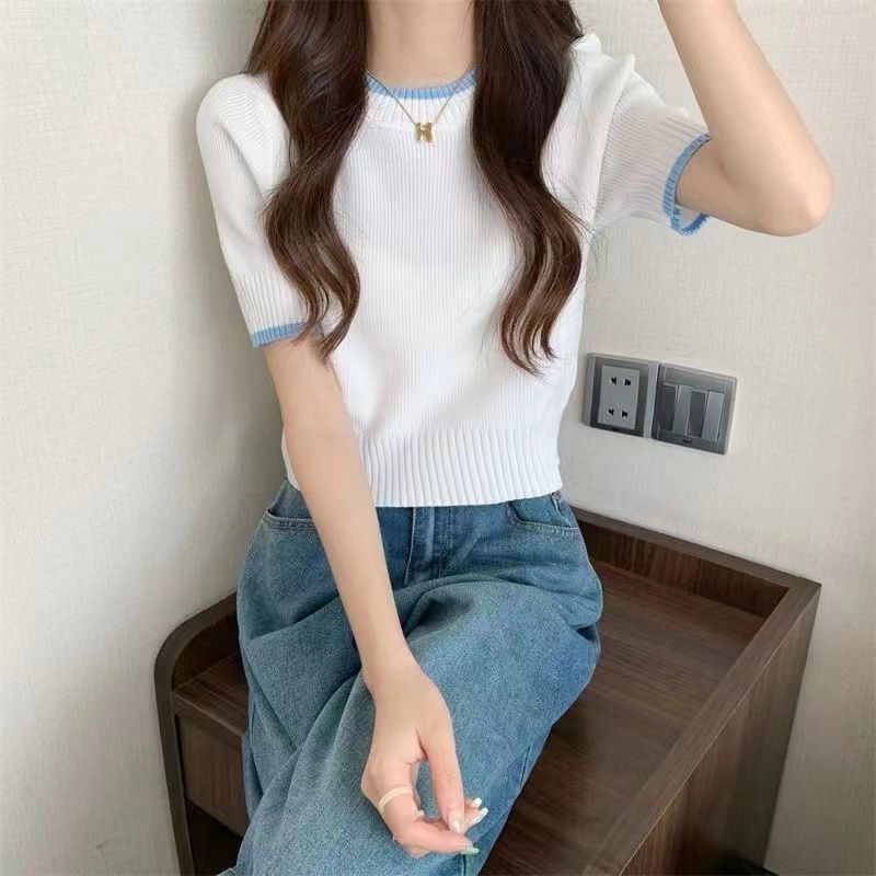 | nameOriginal | Small Waist Slimming Short Ice Silk Knitted Shirt Top Gentle Wind Contrast Color Shoulder Short-sleeved T-shirt for Women in Summer |