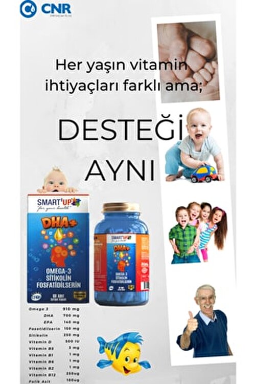 SMART 'UP DHA+ More DHA than an Omega 3… CONTENTS: 2 Softgel Capsules Fish Oil Total 1400 mg OMEGA-3 910 mg DHA 700 mg EPA 140 mg Citicholine 250 mg Phosphotidylserine 150 mg Vitamin D3 (Cholecalciferol) 500 IU Vitamin B1 1 mg Vitamin B2 1 mg Vitamin B5 3 mg Vitamin B6 1 mg B12Vitamin (Methilcobabab Lamine) 250 mcg Folic Acid 100 mcg Alcohol free. Paraben free. Does not contain colorants. It does not contain artificial flavors and Gluten. What's the difference between Smart'up Dha+? Why should we specifically use SMART'UP Dha+. Fish consumption per capita in Turkey is around 6.5 kg. In societies like us that do not consume fish, especially deep-sea fish, we must necessarily buy Omega-3 oils from the outside. When we examine the table of active ingredient values of SMART'UP DHA+ Omega-3 SoftGel, you will better understand the power it has. The form with 60 SoftGel is specifically selected and the 30-day dose has been calculated. At the end of this time you will admire the change of your body and this strength that you will feel. Since the fetus in pregnant women and the baby in breastfeeding receives essential fatty acids especially DHA from the mother, it is necessary to use S MART'UP Omega-3 Dha in order for this group to consume Choline compounds and DHA+EPA together throughout pregnancy and during lactation. Today, there is a greater increase in the use of digital devices