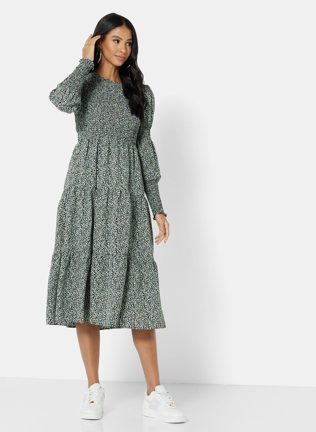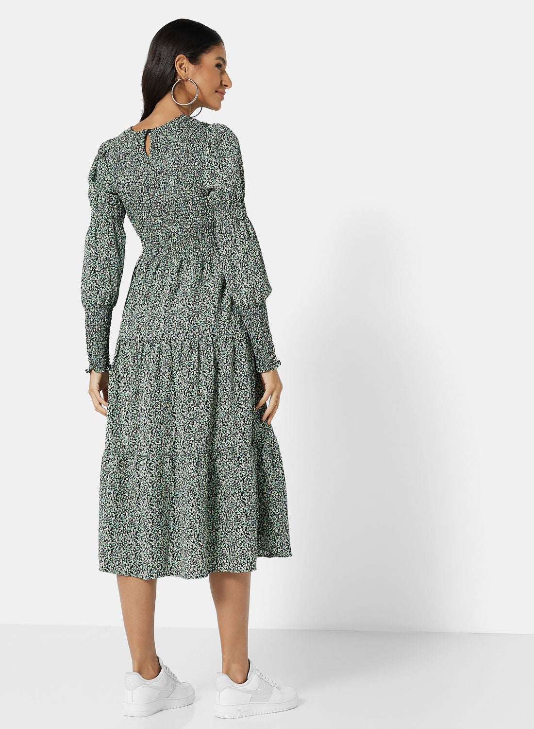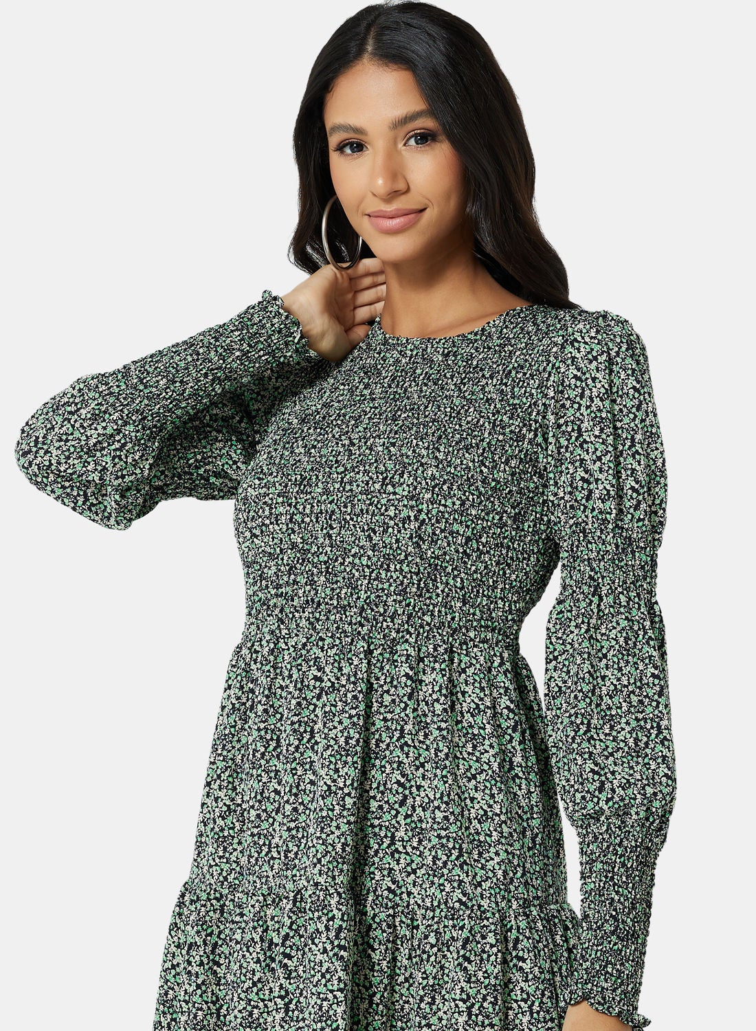 This product features a soft and lightweight polyester fabric that provides comfort. It showcases a charming ditsy floral print all over, with a round neckline and long sleeves. The smock detail on the chest, sleeves, and back adds a stylish touch. The keyhole with a button top closure on the reverse completes the look. To maintain its quality, please follow the care label instructions when washing.