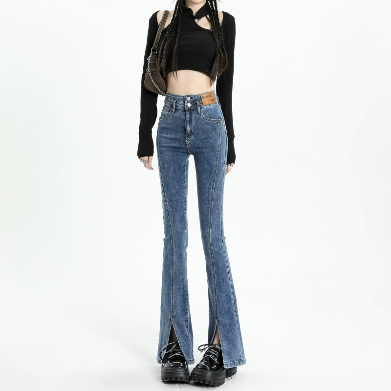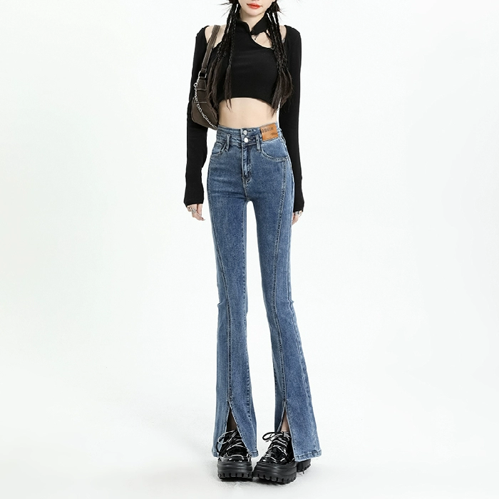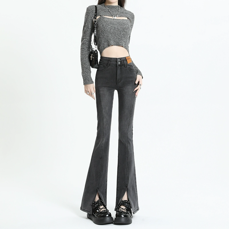 | nameOriginal | Smoke gray slit high waist horseshoe slightly flared jeans |