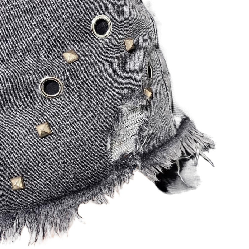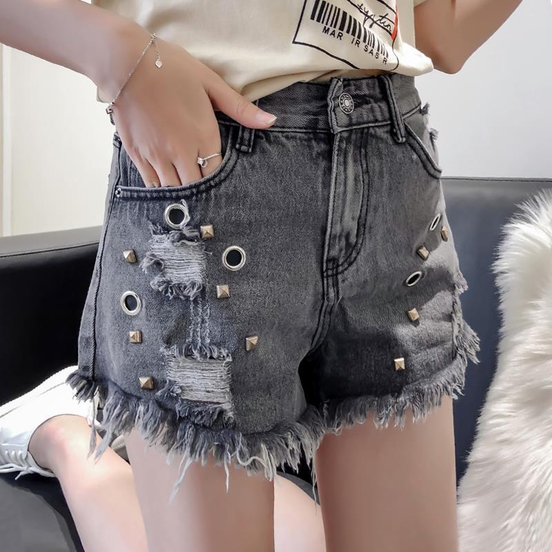 | nameOriginal | Smoke Grey High Waist Denim Shorts Women's Summer 2024 Korean Style New Arrival Rivet Ripped Edge A- shaped Wide-leg Hot Pants |