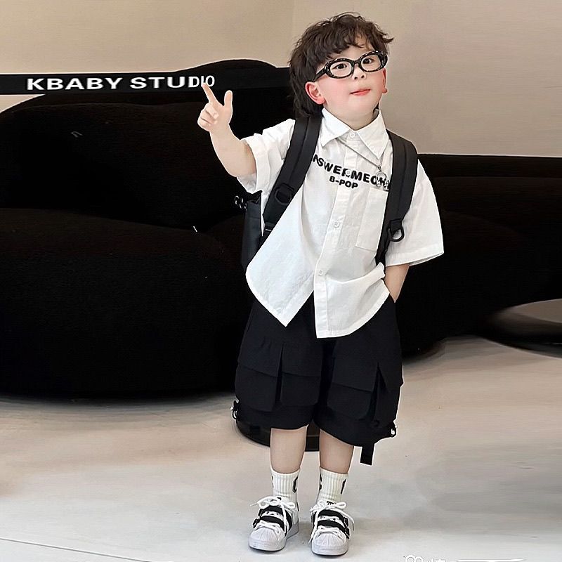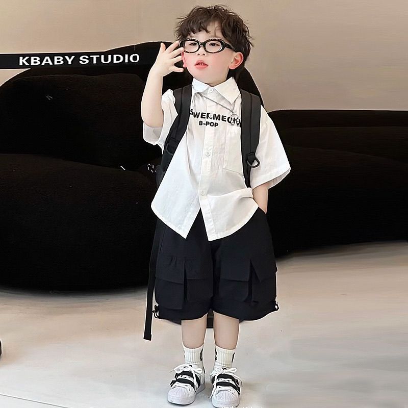 | nameOriginal | SN Boys' Short-sleeved Shirt Two-piece Set Children's White Shirt Pure Cotton suit Summer Baby's Black Tooling Shorts |