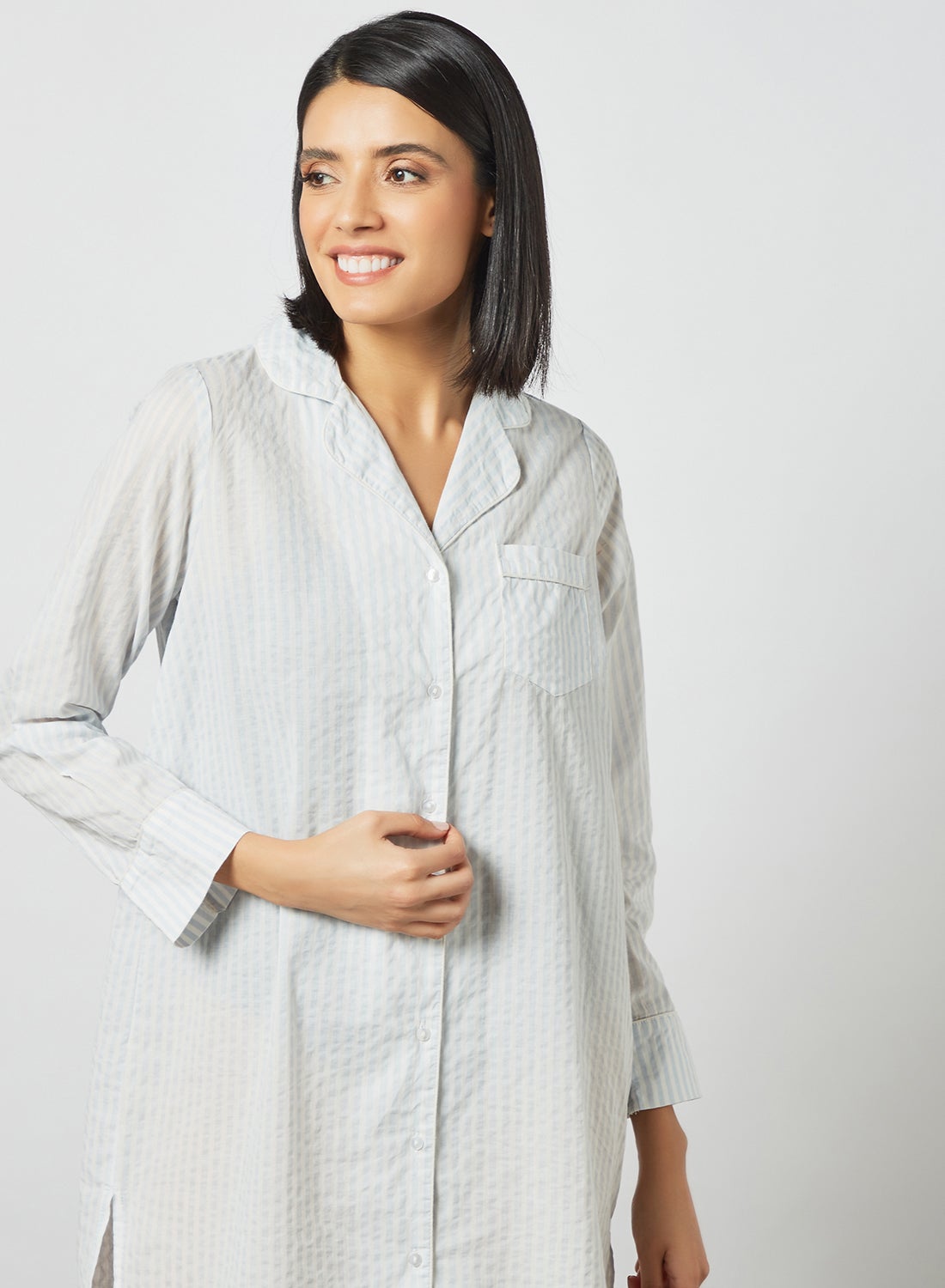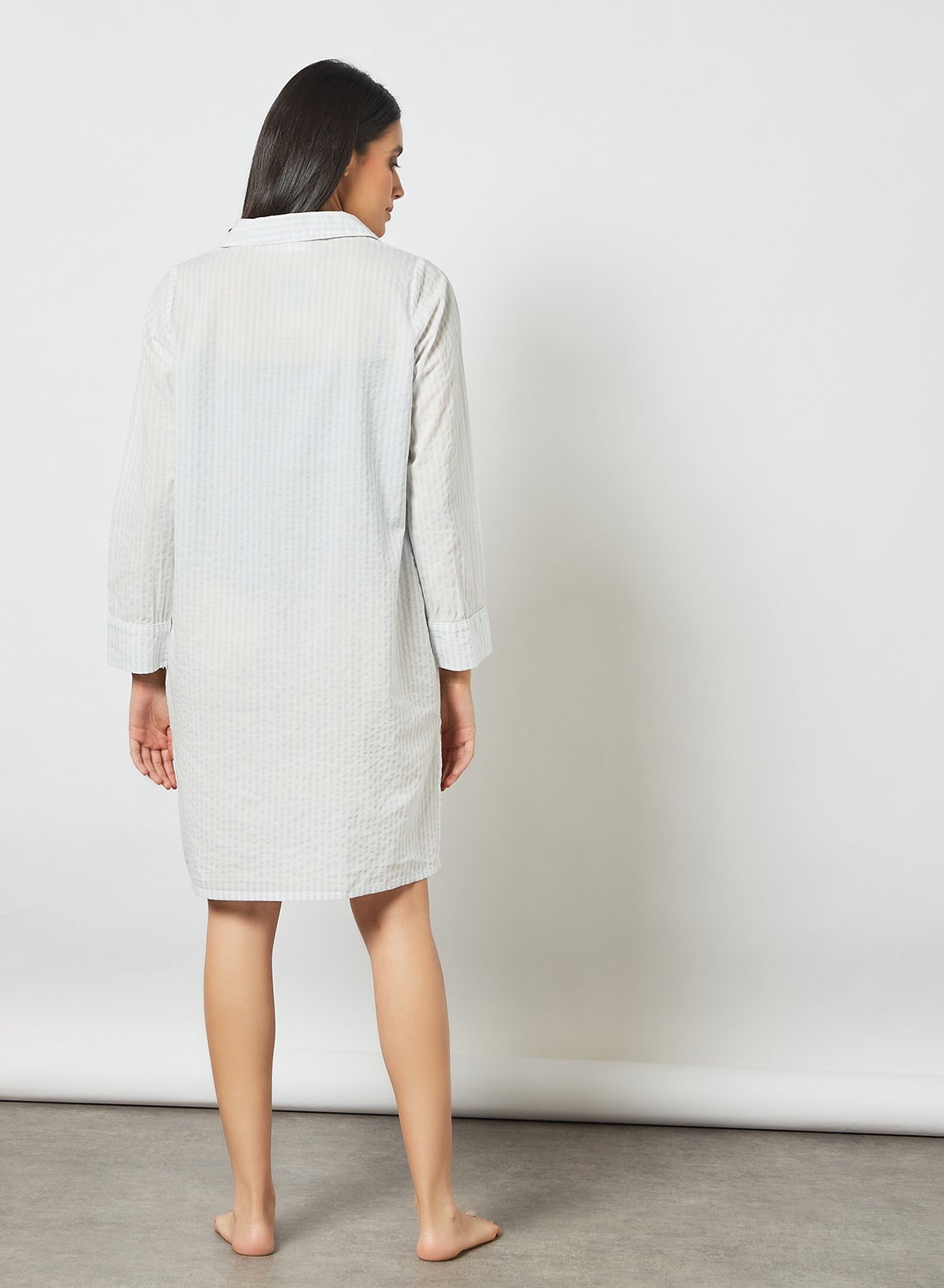 This product features a soft and airy cotton material that provides comfort. It is designed with a nursing feature that allows for easy unbuttoning of the dress. The dress also comes with a collared neck and long sleeves, and is secured with a button closure. To ensure the longevity of the product, it is recommended to follow the care label instructions when washing.