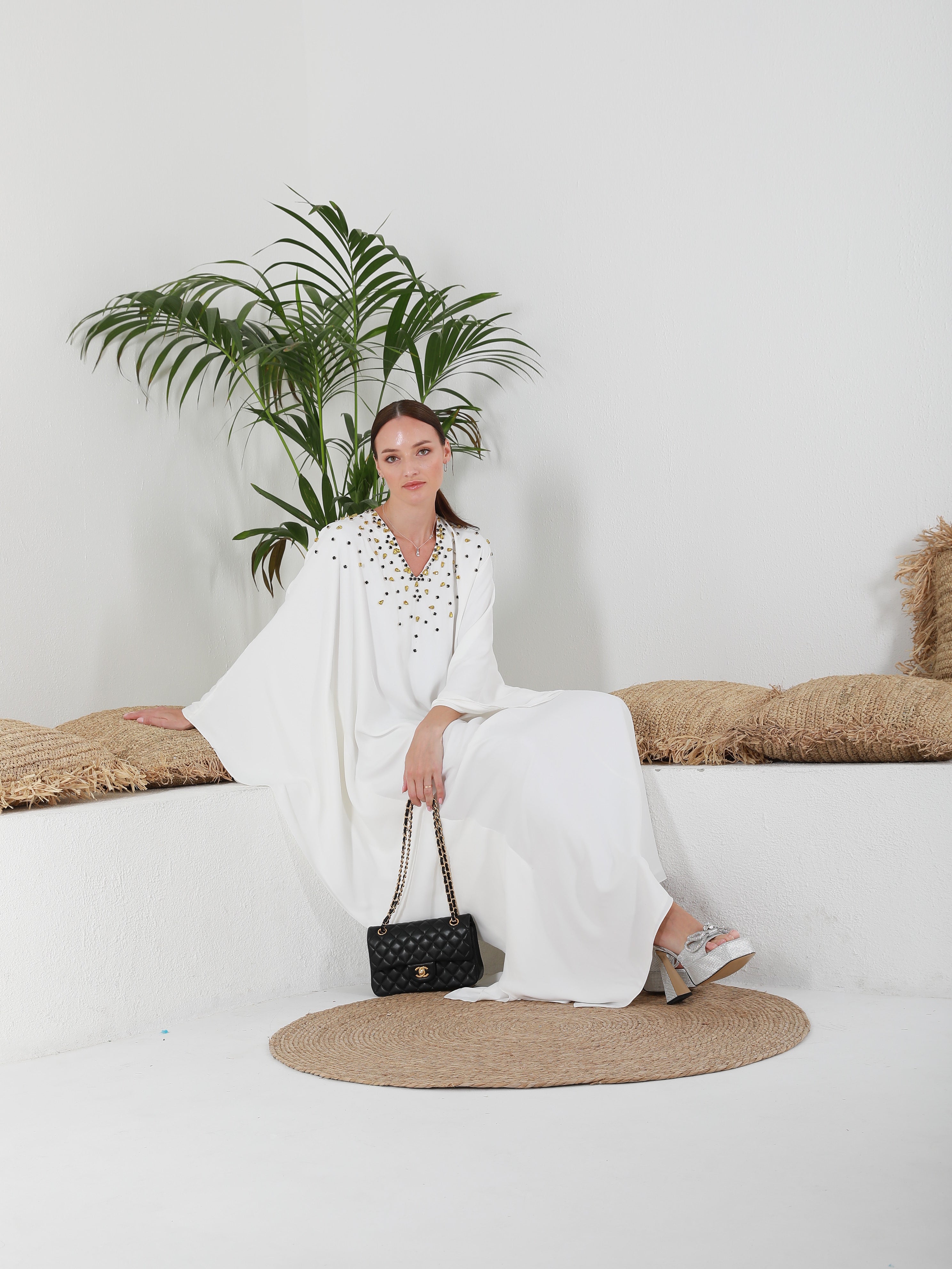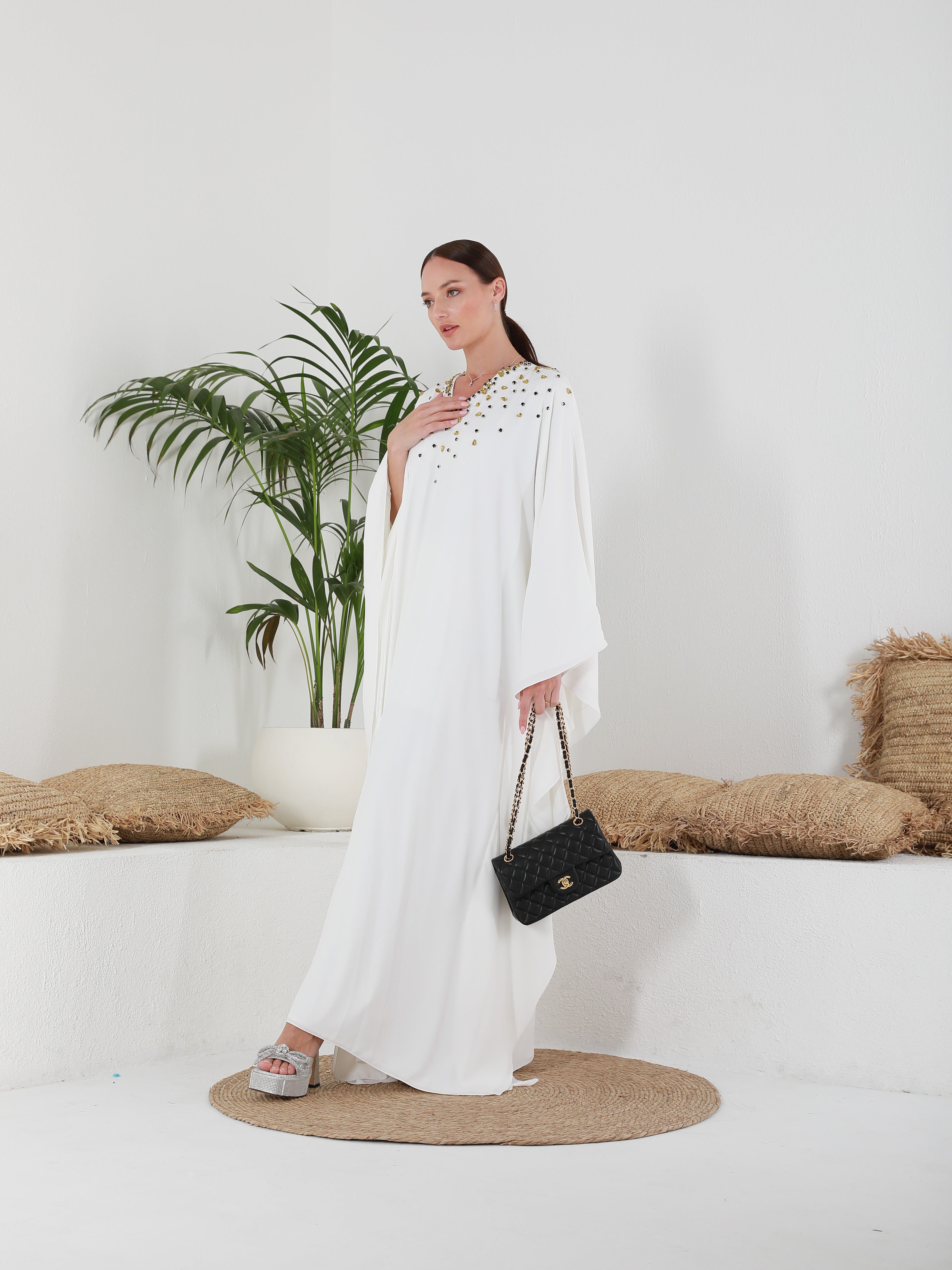 Introducing our stunning Maxi Abaya, crafted from high-quality crepe fabric in a timeless white hue. This elegant piece is designed to fit all sizes, ensuring a comfortable and flattering fit for everyone. The Abaya is beautifully adorned with intricate embroidery, featuring exquisite black and gold beads that add a touch of glamour and sophistication. Elevate your wardrobe with this versatile and stylish Abaya, perfect for any special occasion or formal event.