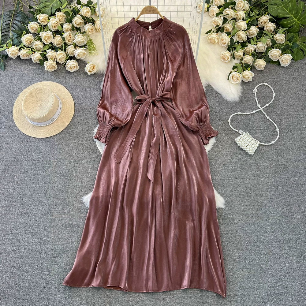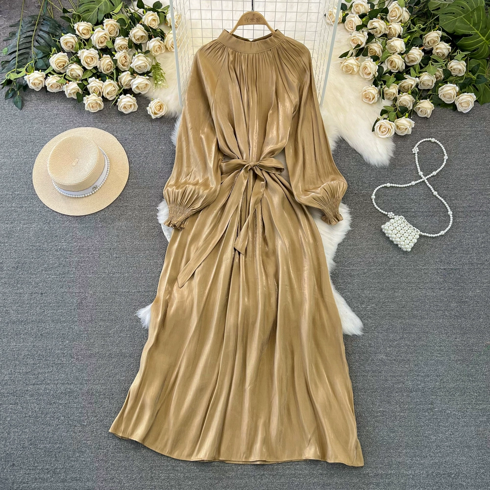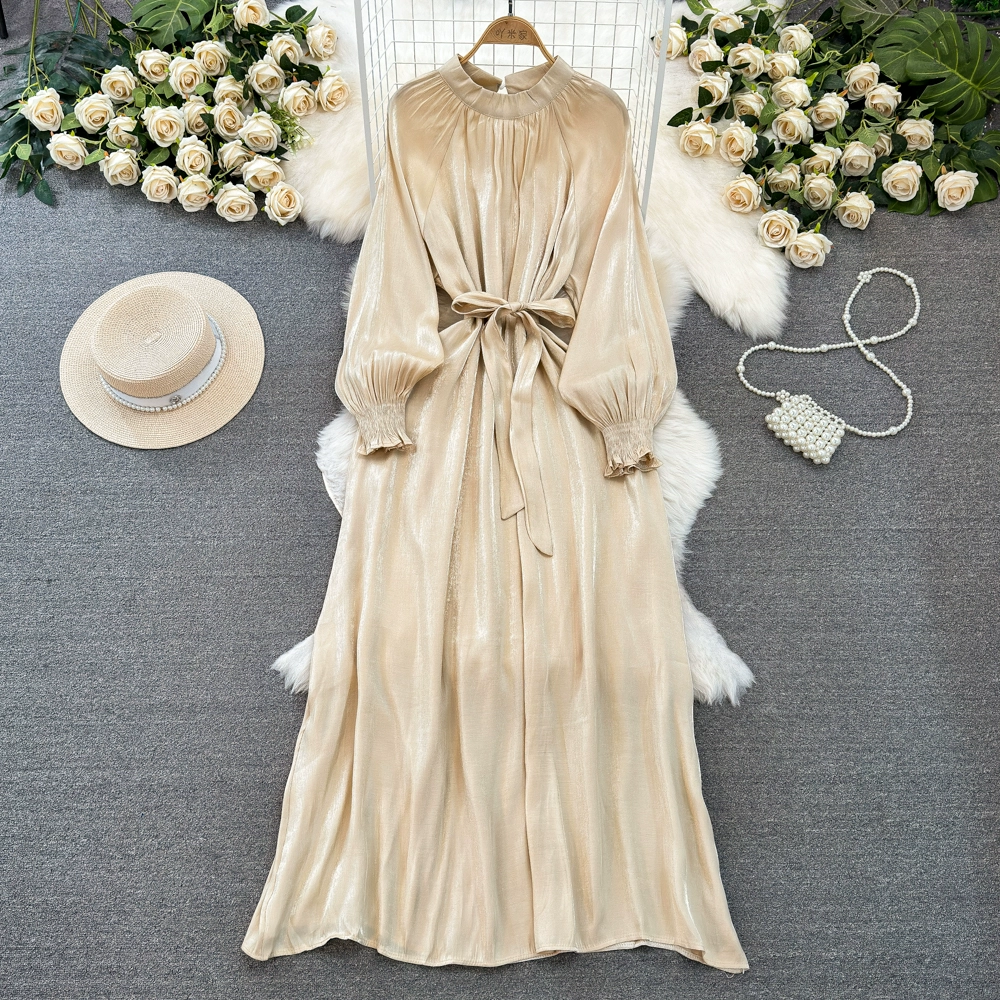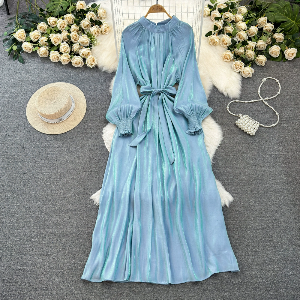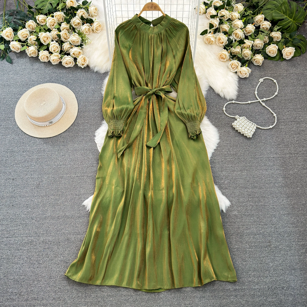 Socialite lantern long-sleeved stand-collar glossy dress