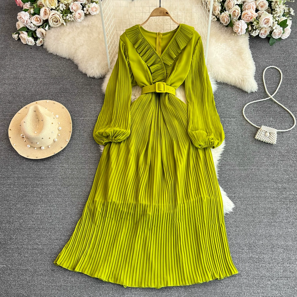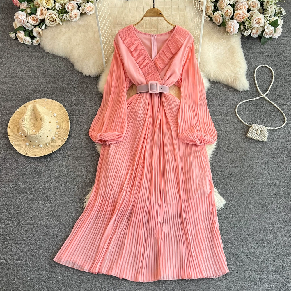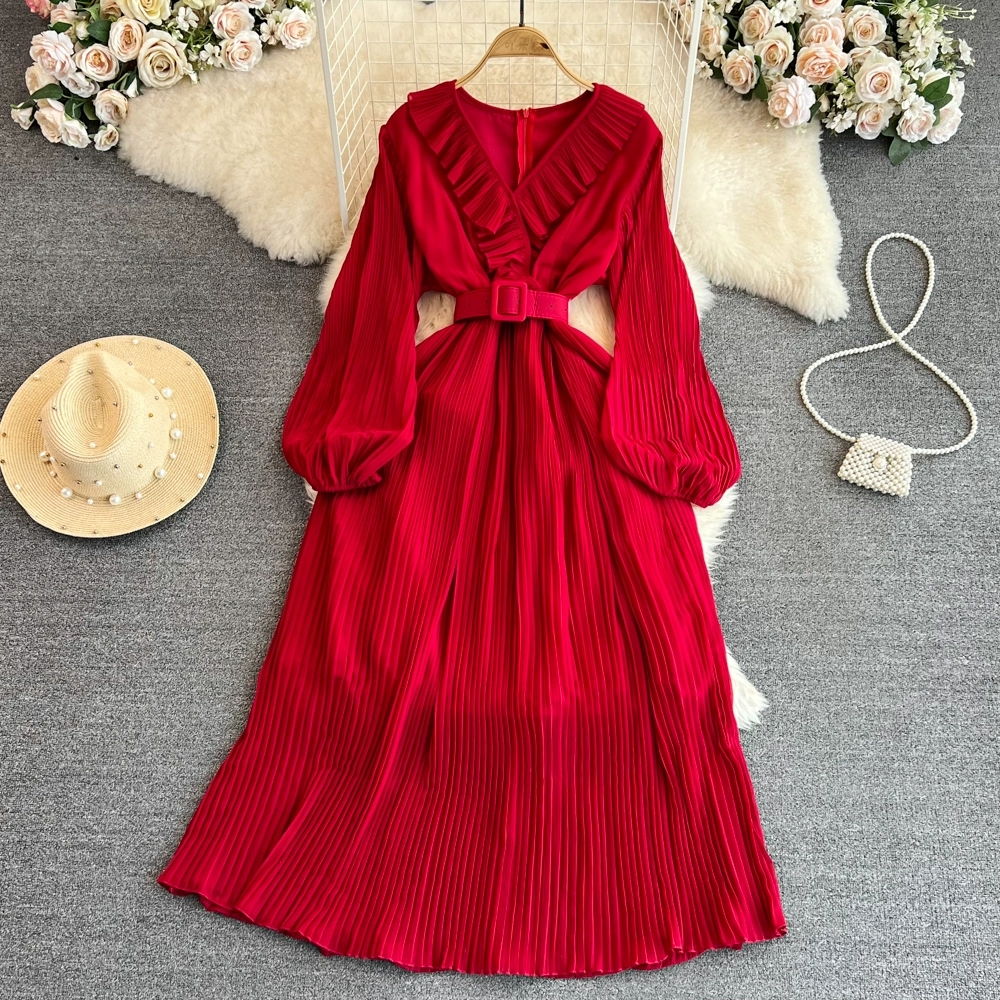 | nameOriginal | Socialite long-sleeved V-neck ruffled A-line pleated dress |