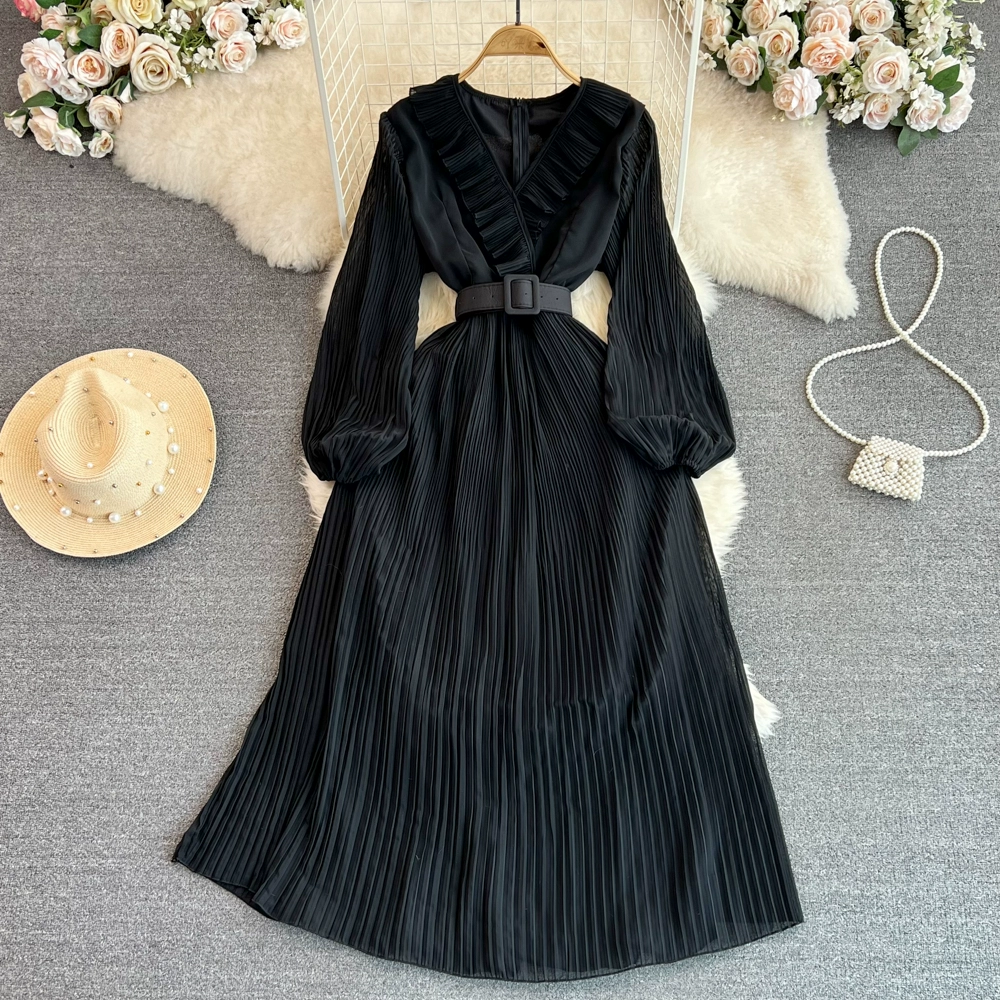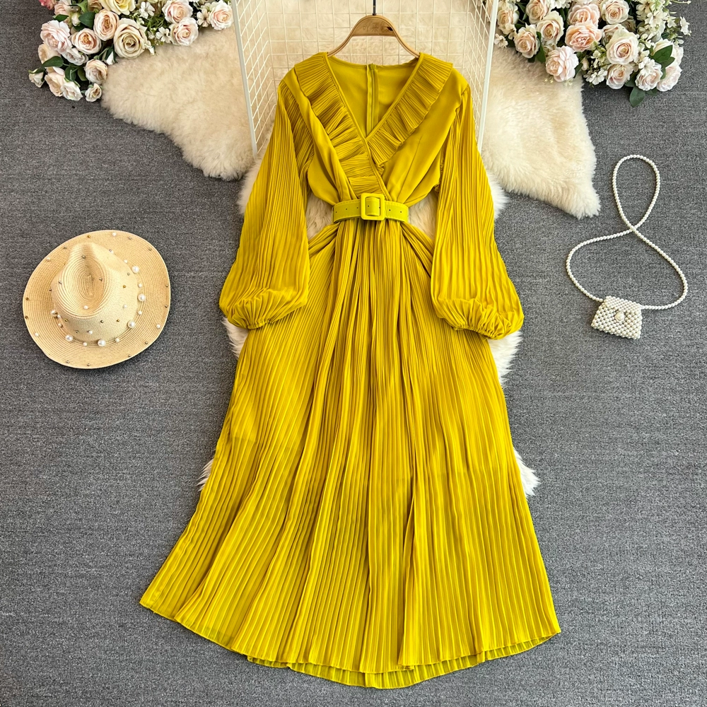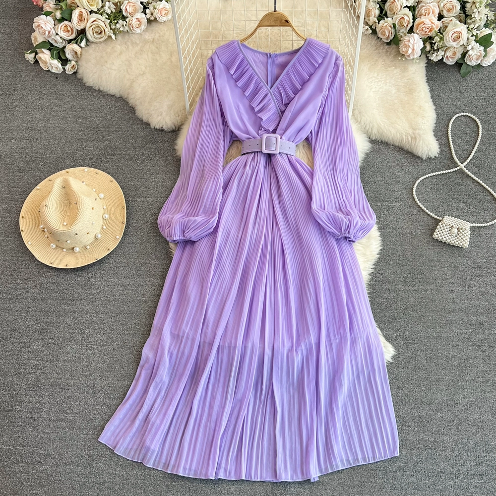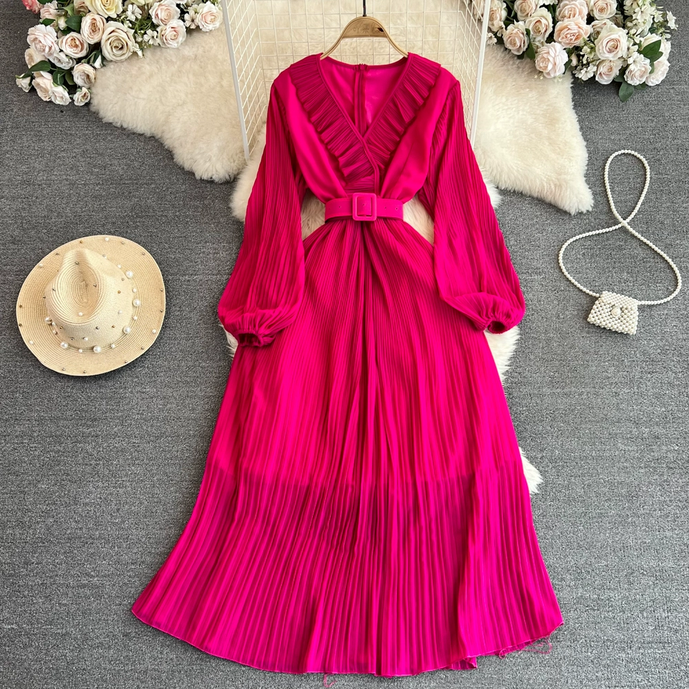 | nameOriginal | Socialite long-sleeved V-neck ruffled A-line pleated dress |